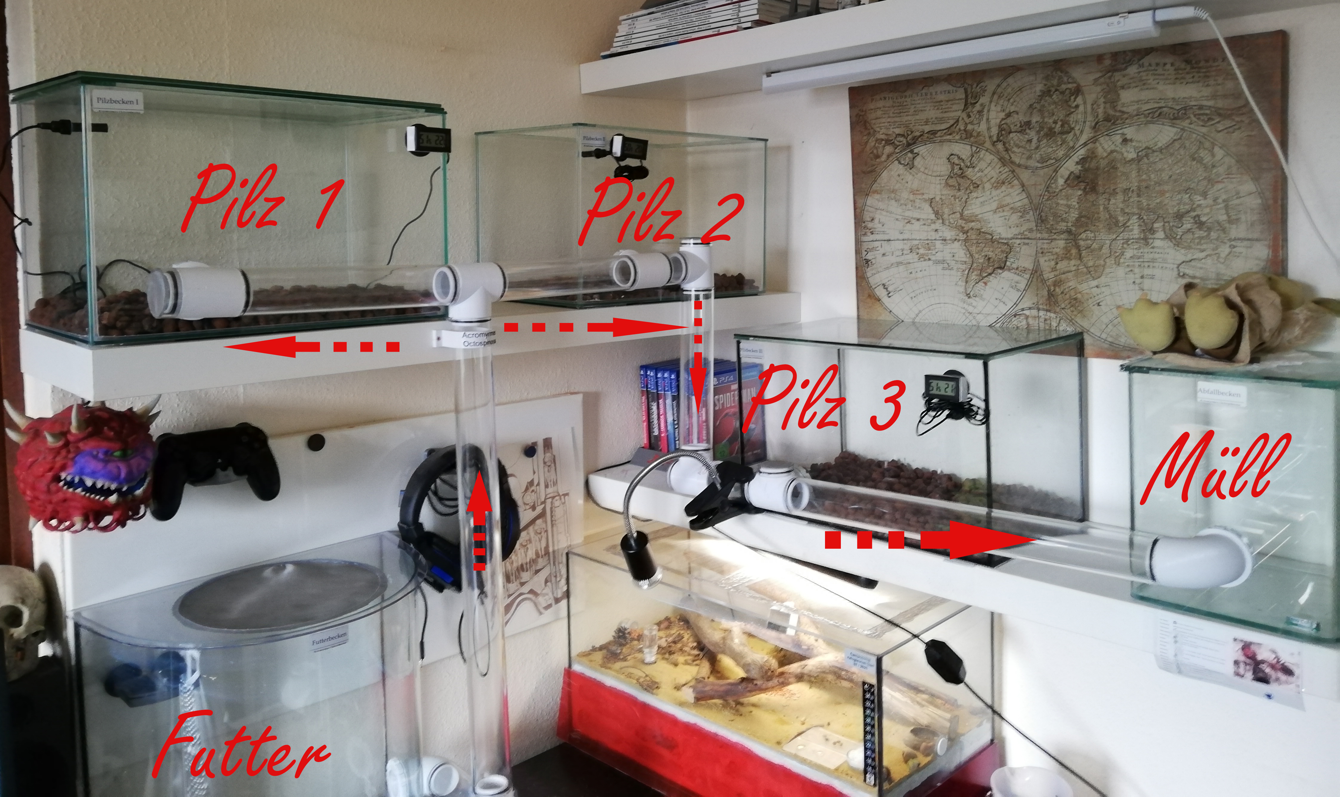 So, es neigt sich langsam dem Ende zu. Alle 3 Pilzbecken wurden gekauft, gebohrt, Rahmen geklebt, Rahmen aufgeklebt, Deckel geschnitten und mit Blähton befüllt. Verbindung von der Futterstelle zu PB1(Pilzbecken 1 ) und von dort aus zu PB2 steht schon einmal. Das Sonderteil zum Verbinden von PB2 zu PB3 ist in einer halben Stunde fertig. Wenn das Rohr dazu gesägt und alles montiert ist, fehlt nur noch ein gerade Stück zum Abfall.