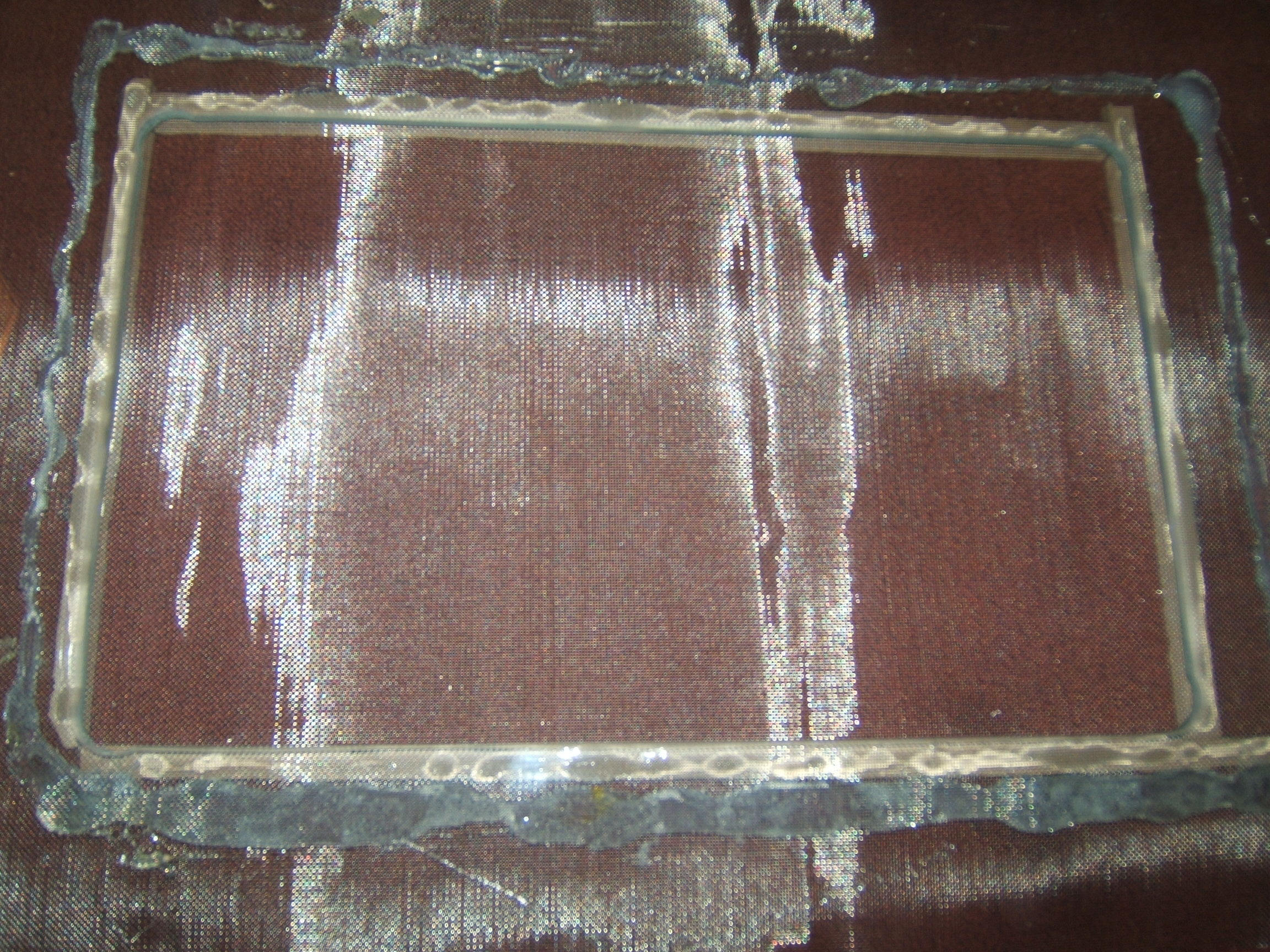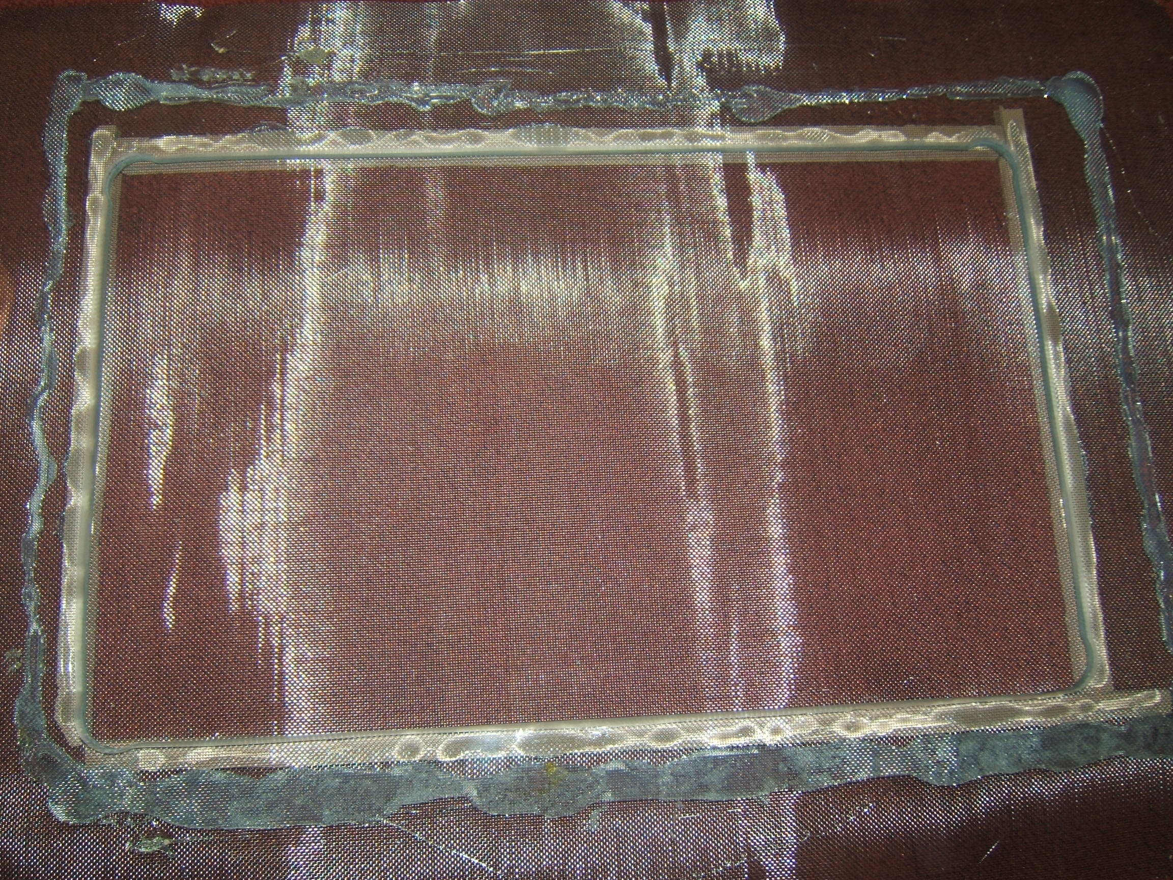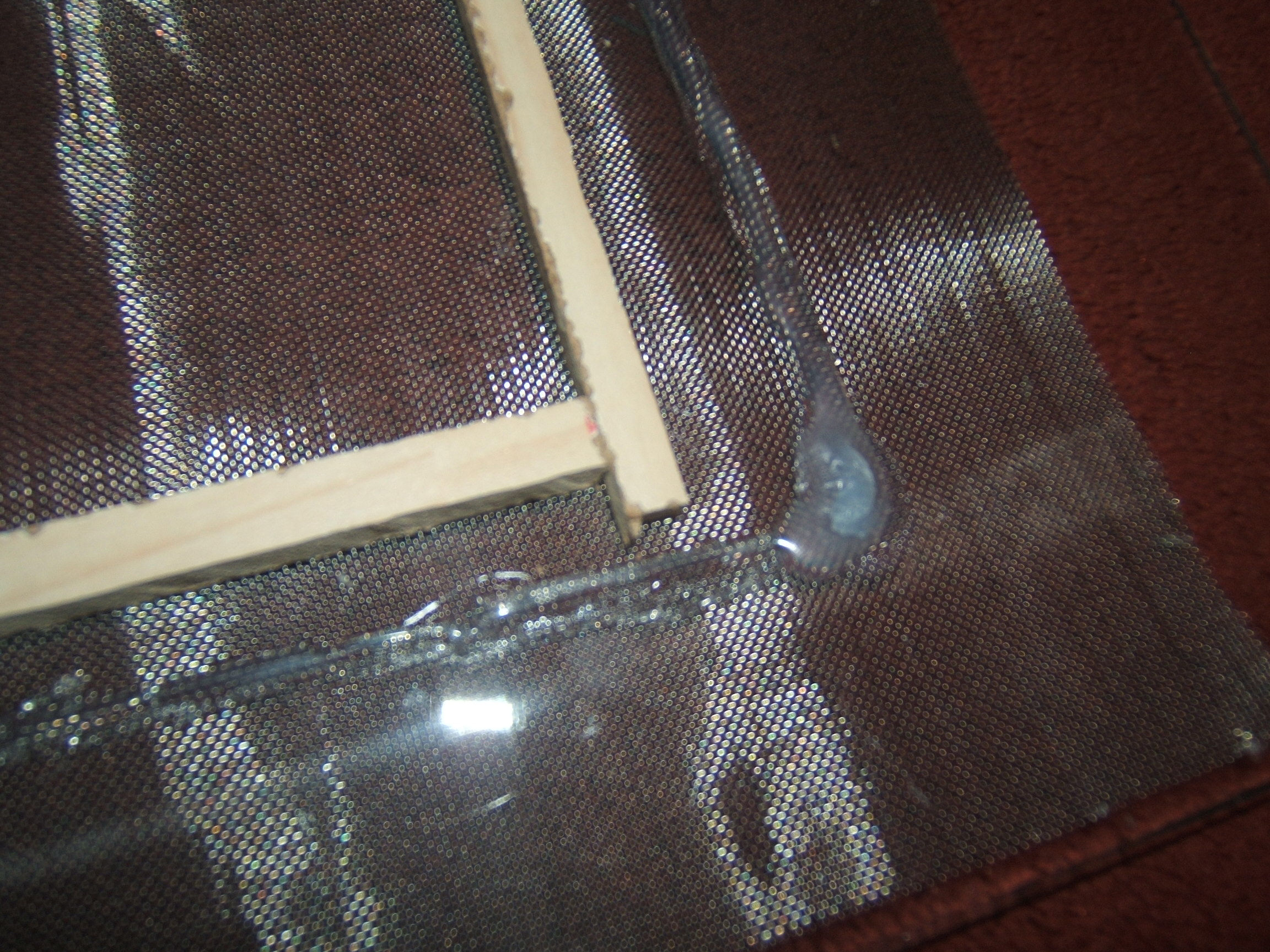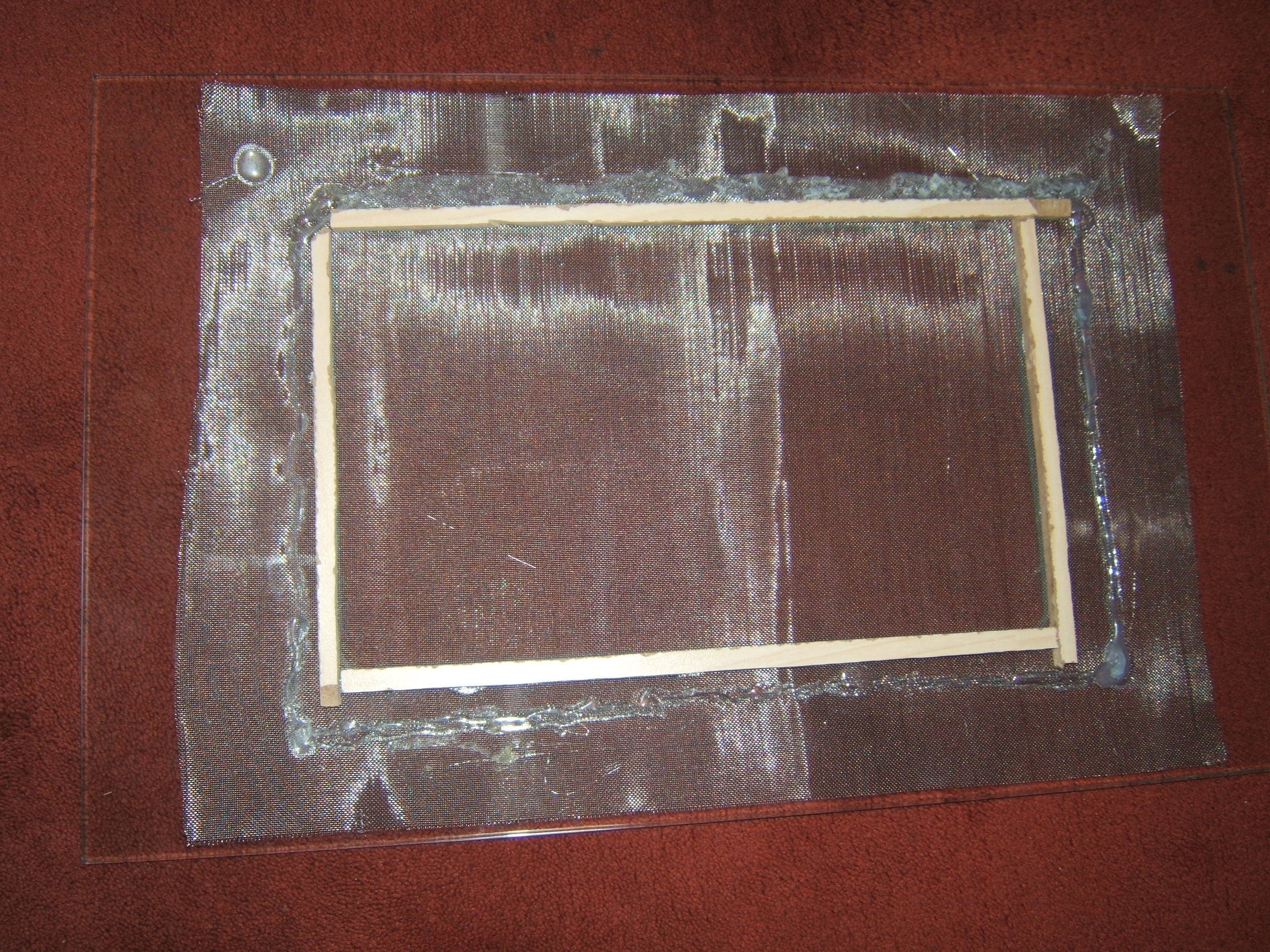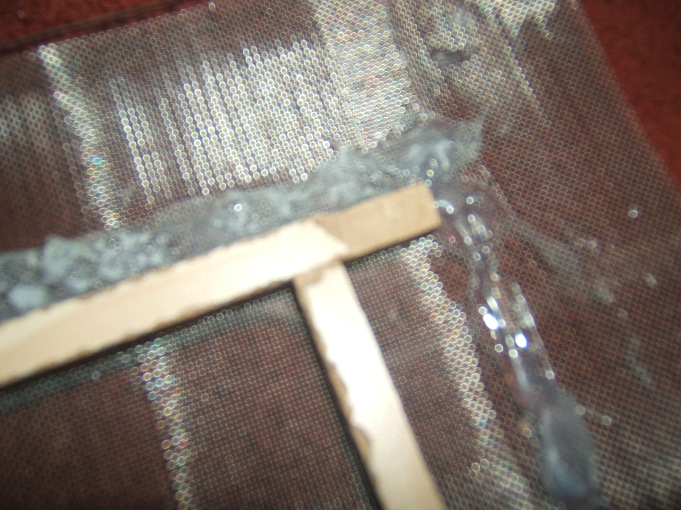 Nun kam mir die Idee,mit kleinen Holzlatten die ich zusÀtzlich am Rand anklebe,Die Gaze dicht am Glas zu halten.