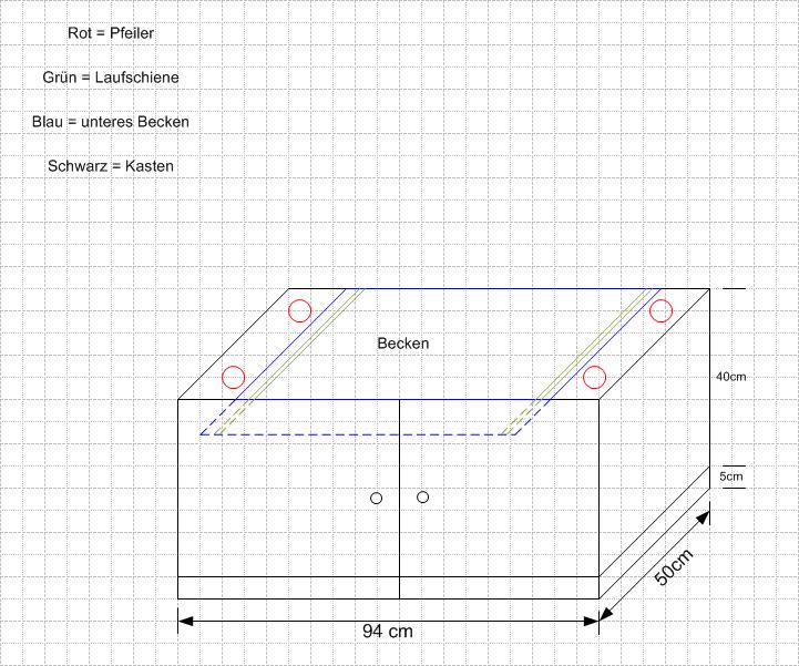 Was haltet ihr davon, wenn ich fürs untere Becken eine Schiene einbaue. Somit kann ich das Becken z.B: Bis zur hälfte rausziehen und das muss ich dann nur machen wenn ich mal hinten was zu bewerkstelligen hab. Eher vorne wird wasser und Futter angeboten und gut ist. Sagt mal eure meinung. Ich hab gedacht das ich 1-2x im Monat das Becken ausziehen müsste.