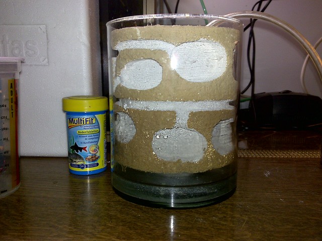 Noch ist das ganze nicht fertig. Als nĂ€chstes wird der Schlauch an das Ausgangsloch angeklebt. Erste Versuche mit Heisskleber liefen schief. Als nĂ€chstes versuch ich es mit Aqauriensilikon. An den Ausgang kommt ein Plastikgelenk, das ich im Aquarienladen bekommen habe (ist fĂŒr Aqaurienfilter). Daran kommt dann der Schlauch.