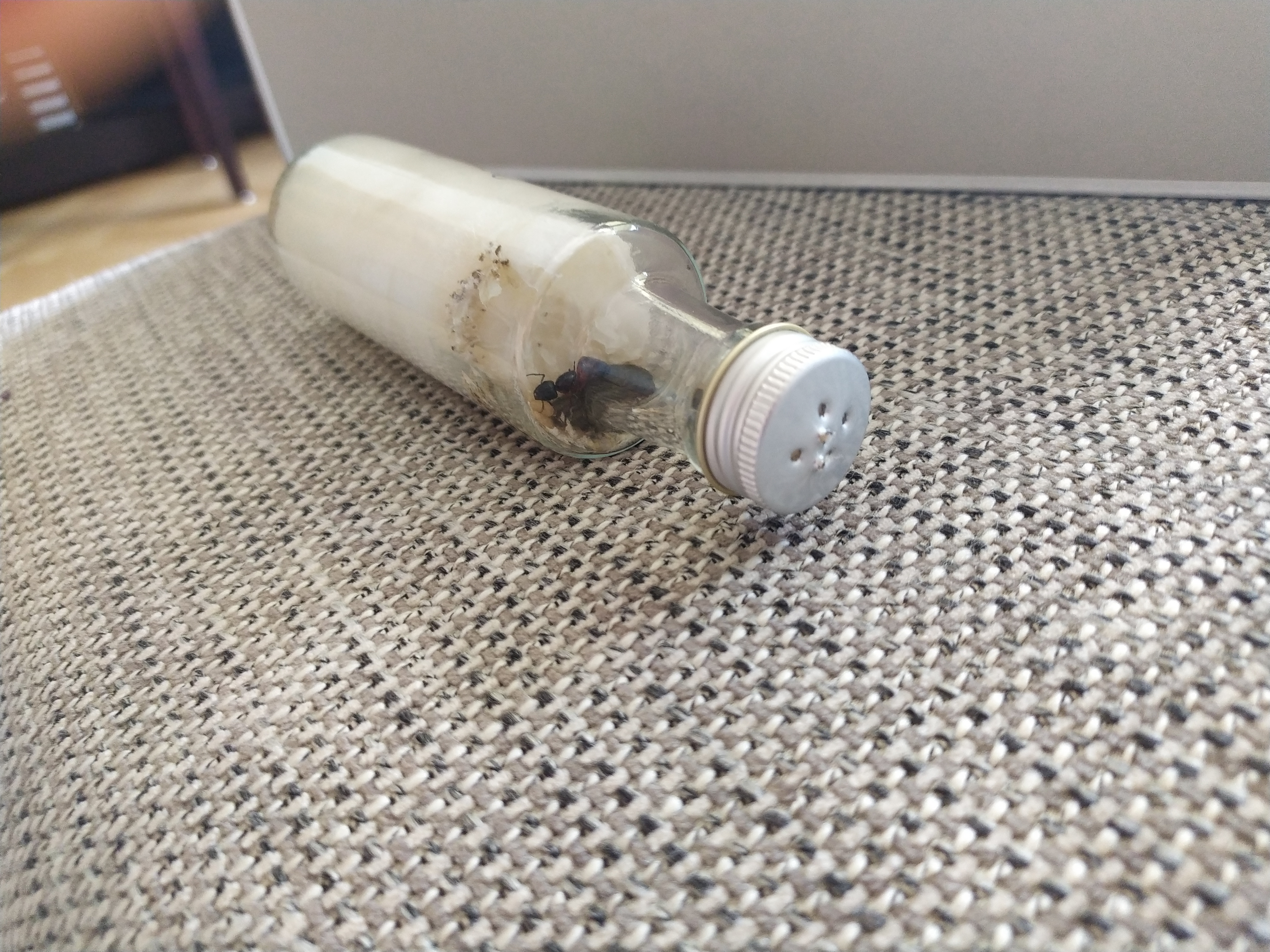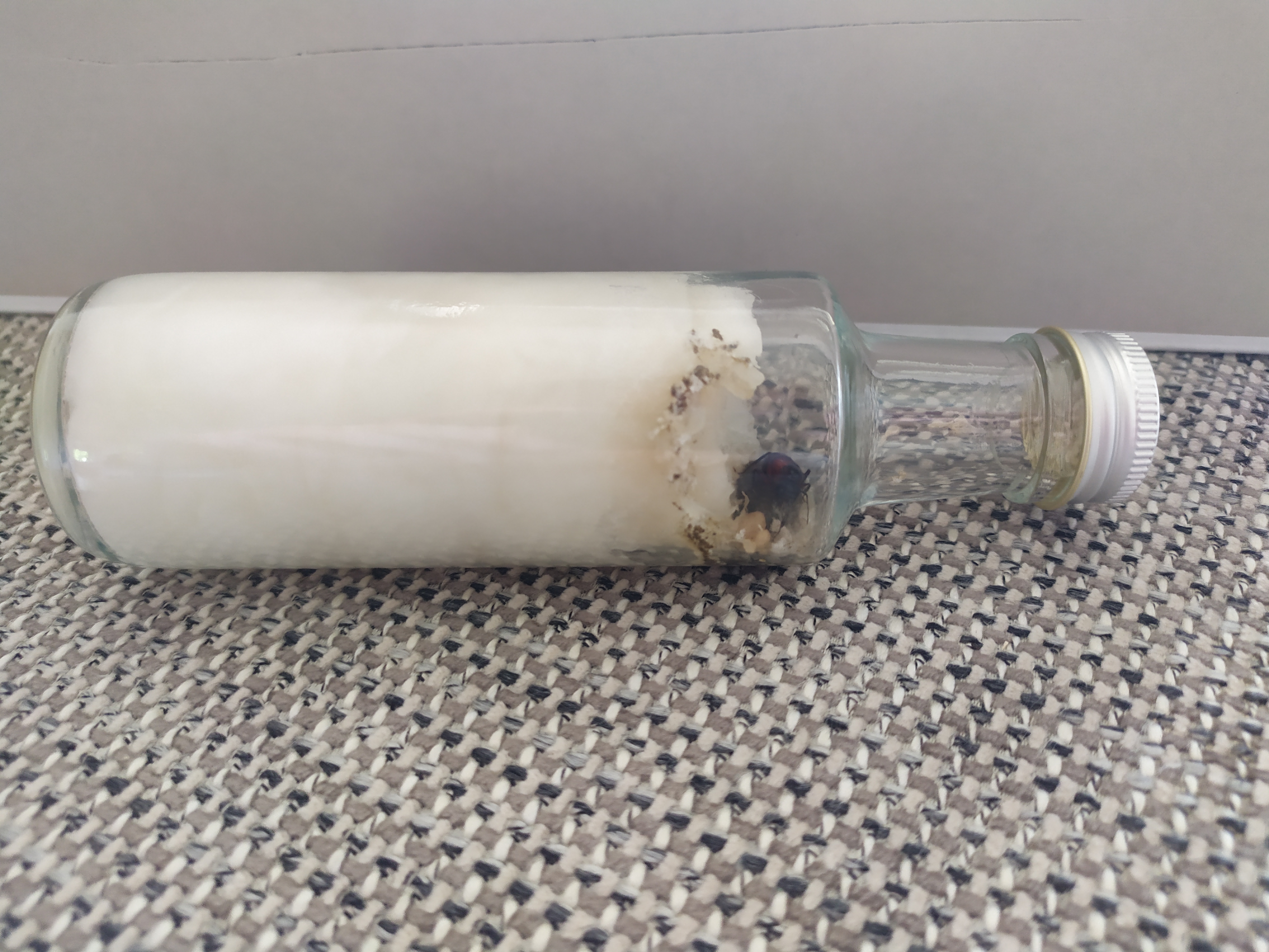 Das Nest ist jetzt über einen Monat in Gebrauch und die Watte enthält noch immer genug Wasser. Meine Camponotus ligniperdus-Gyne scheint sich auch mit zunehmender Austrocknung der Oberfläche einfach etwas weiter in die Watter zu graben. So sollte zumindest für die Gründungsphase die Wasserversorgung gesichert sein, bis dahin kann man sich ja nach einem besseren Nest umsehen oder auch einfach nach einem Reagenzglas.