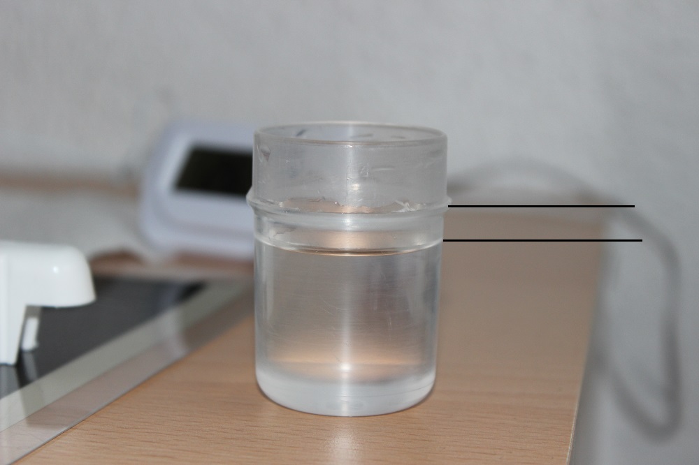 Mit einer Spritze das Wasser wieder heraus gesogen kam ich auf ca 26 ml, was man dabei nicht vergessen darf, das Wasser war jetzt wĂ€rmer als wie beim HineinfĂŒllen und hatte somit auch an Volumen zugenommen.