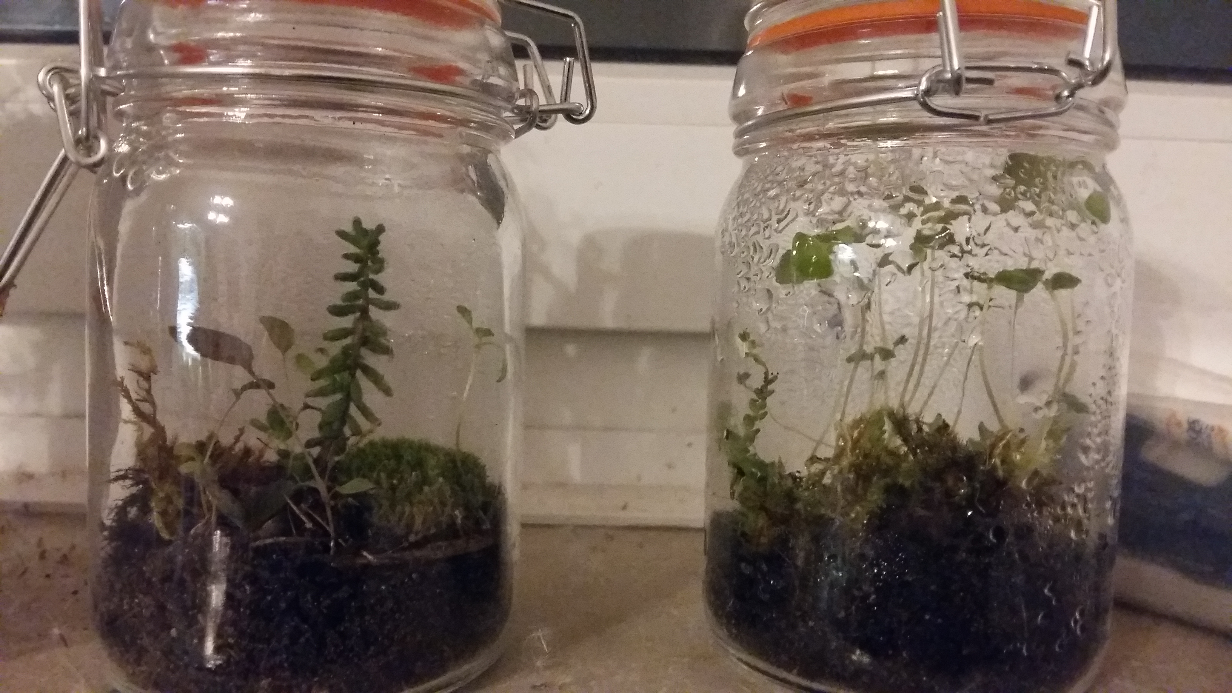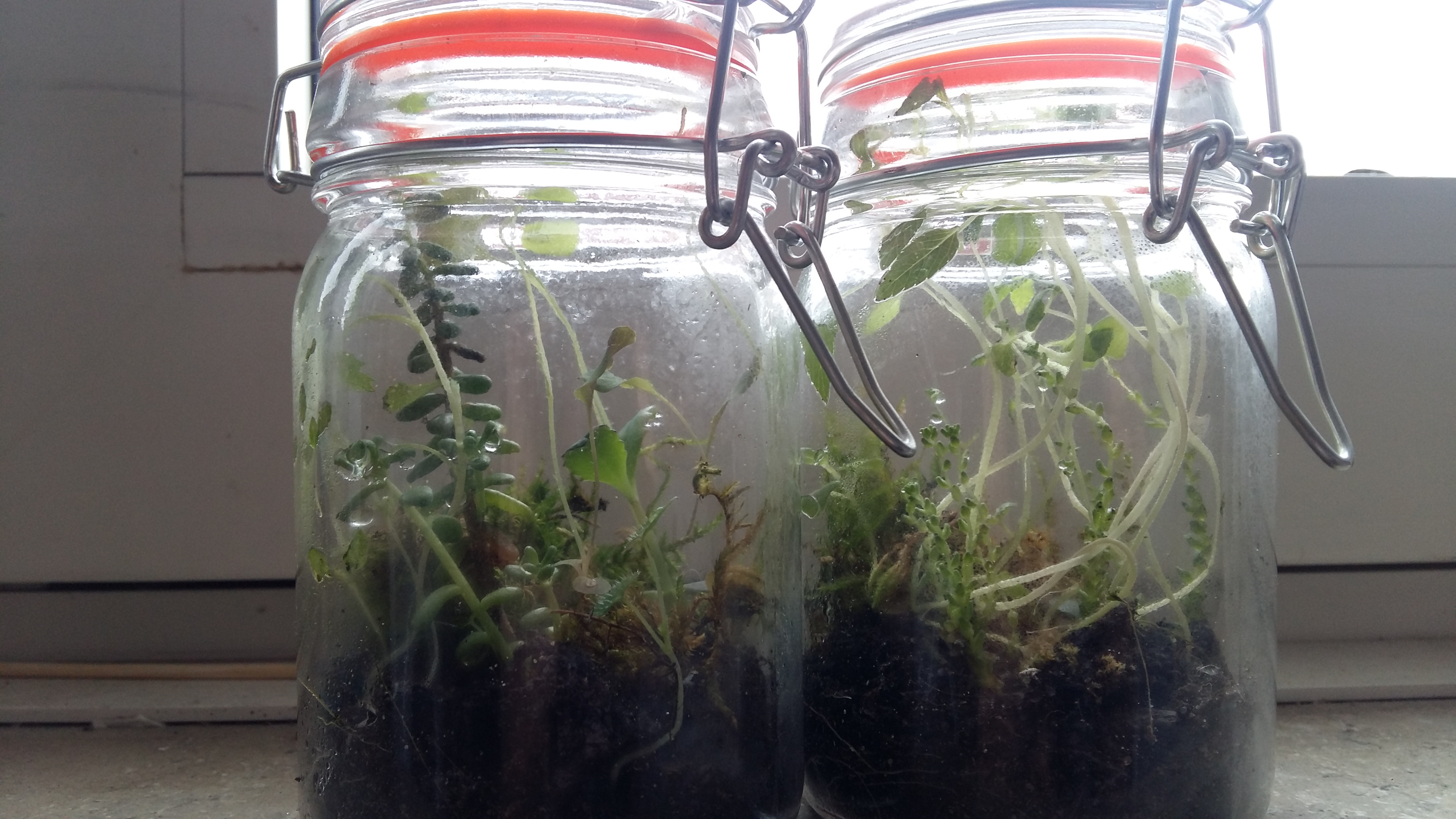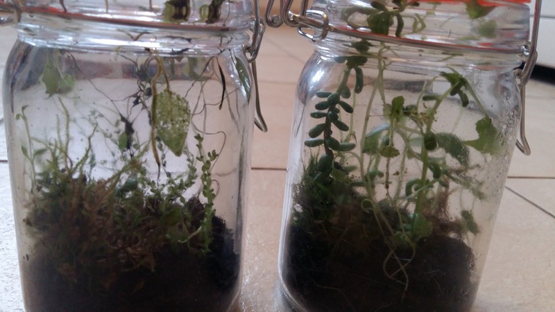 Hier erklĂ€rt sich vielleicht besser, wie es um die Terrarien steht: Beide GlĂ€ser sind immer verschlossen, auĂer als ich sie wegen zu groĂer Feuchtigkeit fĂŒr einen Tag offen lieĂ. Es handelt sich ausschlieĂlich um Pflanzen vom Balkon, mit Ausnahme der kleinen Chia-Pflanzen in einem der GlĂ€ser. Trotz Kondenswasser ist ein Teil des Mooses vertrocknet.