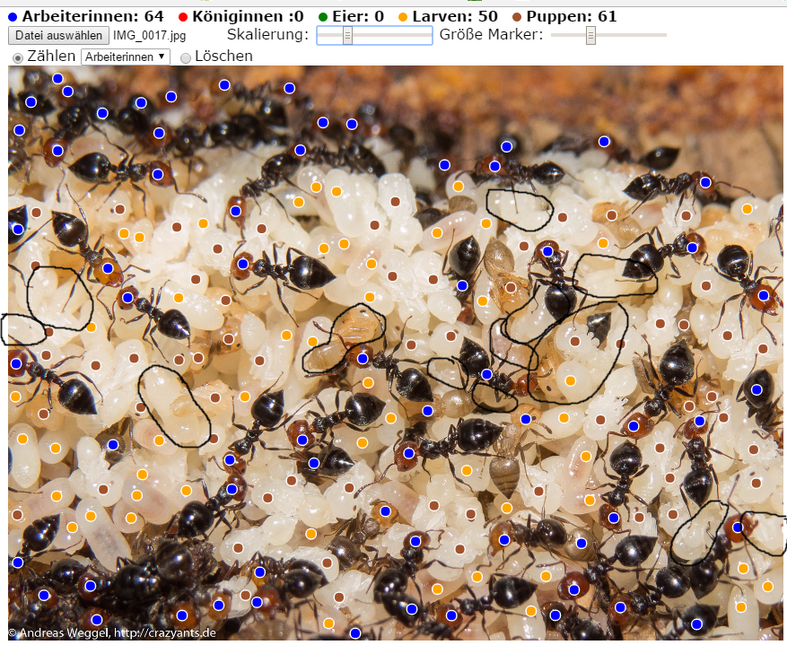 Letztlich soll es nur als ZÀhlhilfe dienen. Dass einige Ameisen nicht markiert sind, liegt ja nur an mir, weil ich nicht sehr viel Zeit aufgewendet habe, um wirklich jede einzelne zu erwischen. Aber das schöne ist ja, dass ich die selbe Bilddatei neu laden kann und das Programm mir alle bisherigen Markierungen gleich dazu lÀdt. So kann ich dann noch genauer zÀhlen. Genauer als eine grobe SchÀtzung ist das ganze aber allemal.