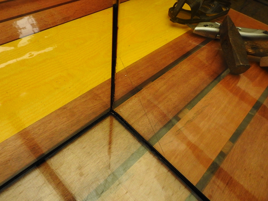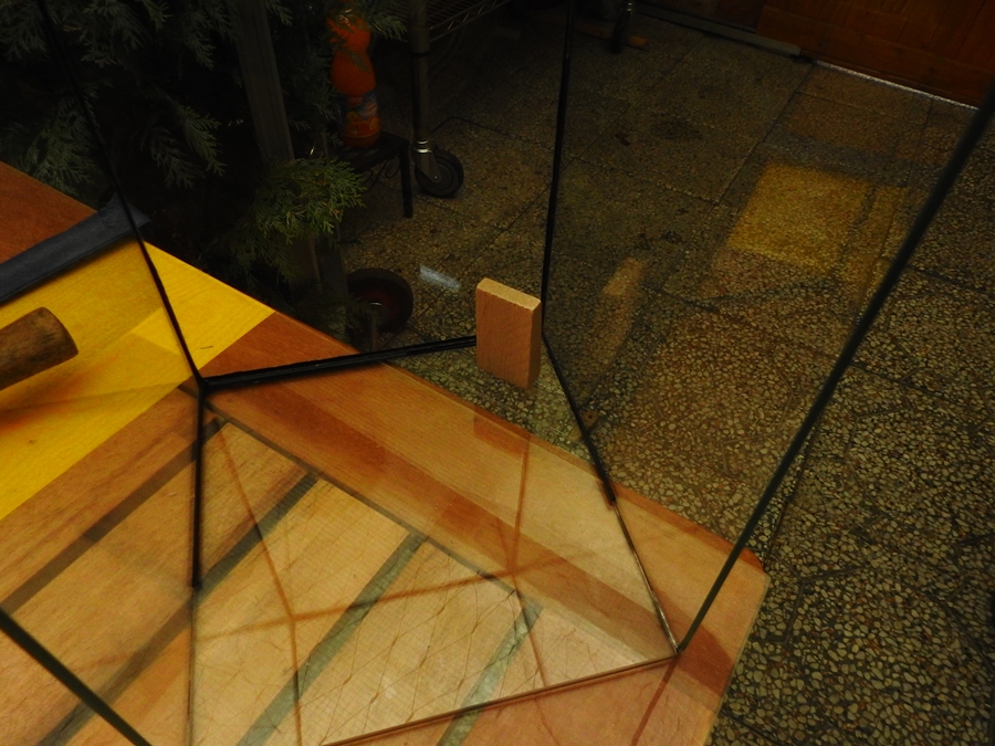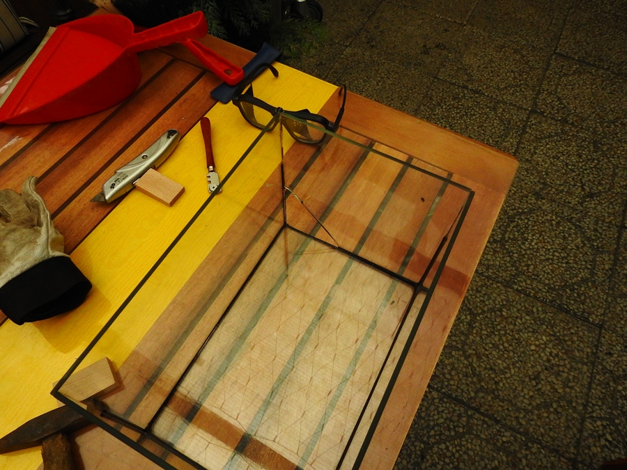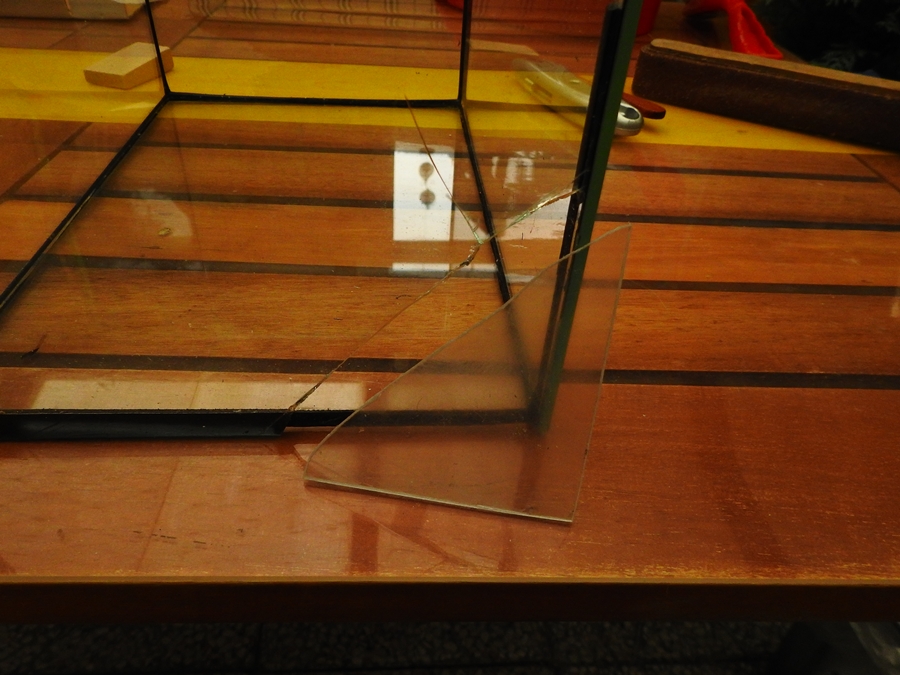Zuerst habe ich die Silikondichtung mit einem Teppichmesser durchtrennt. An einer Seite hat das nicht ganz so gut funktioniert, da die Scheiben direkt aneinander waren. AnschlieĂend mit dem Glasschneider die Ecke, welche raus gebrochen werden soll, angeritzt.