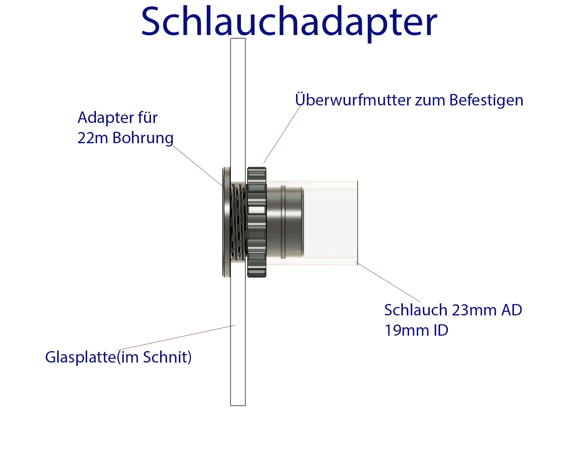 Habe mal einen neuen Adapter konstruiert für eine Bohrung im Glas von 22mm. Man steckt den Adapter durch, kontert den mit der Kontermutter und zieht es leicht an. Sitzt sehr fest auch ohne unnötigen Kraftaufwand. Im Bild sieht man es im Querschnitt einer 4mm dicken Glasplatte befestigt. Am Ende für den Schlauch haben ich einen abstehen Ring gemacht, damit der Schlauch nicht abgehen kann.