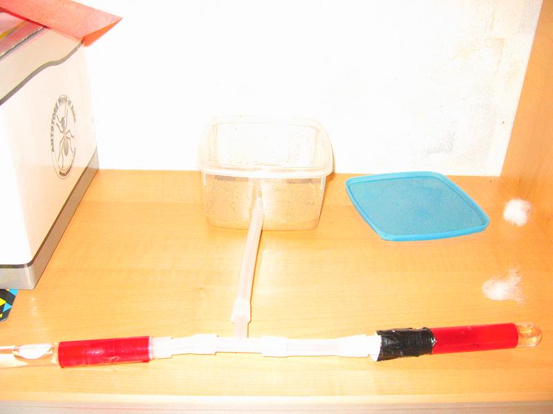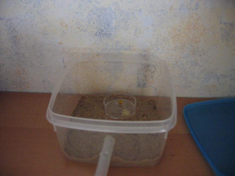 Ich hab also die Box genommen und nen bisschen kleineres Loch gebohrt als der Schlauch ist, somit man den Schlauch, richtig hineinzwengen muss. Somit ist die Ausbruchchance gering. Dann hab ich die Box mit einer 1-2 cm dicken Paraffinölschicht beschmiert (oben am Rand) somit der Ausbruchschutz gewĂ€hrt ist. Der Deckel ist zum zusĂ€tzlichen Schutz, falls ich in der Schule bin. Ne kleine Schale wird zur FĂŒtterung verwendet. Der Sand ist dafĂŒr da, das es ein wenig Gewicht besitzt und das der Schlauch nicht ins leere schaut. D.h. er liegt am Sand auf. Das zweite RG ist erstens dafĂŒr da, da ich damals im RG gefĂŒttert hab und sich auch schon bei einem mal Schimmel gebildet hat, deshalb hab ich einmal zur Vorsorge falls es ihnen ungemĂŒtlich wird ein zweites RG angeboten. Desweiteren kann ich ja auch immer etwas anschließen falls ich sie umziehen lassen will.