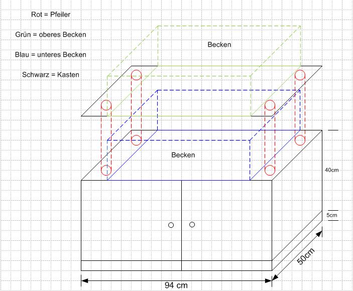 Aber hey, das lĂ€sst mich wieder leicht aufatmen, da du dann die 4 StĂŒtzen fĂŒr die Abstellplatte des oberen Beckens ein paar Zentimeter höcher machen kannst, da ja nicht soviel Gewicht auf ihnen lastet!