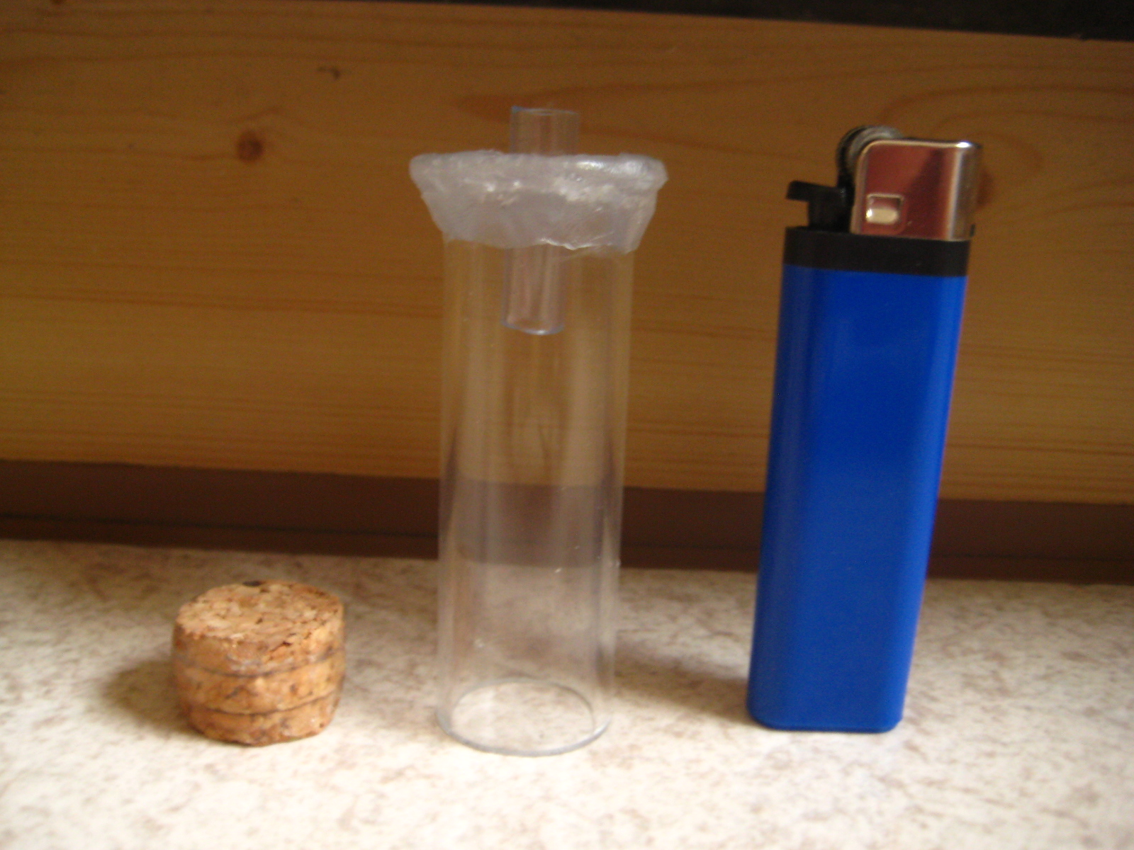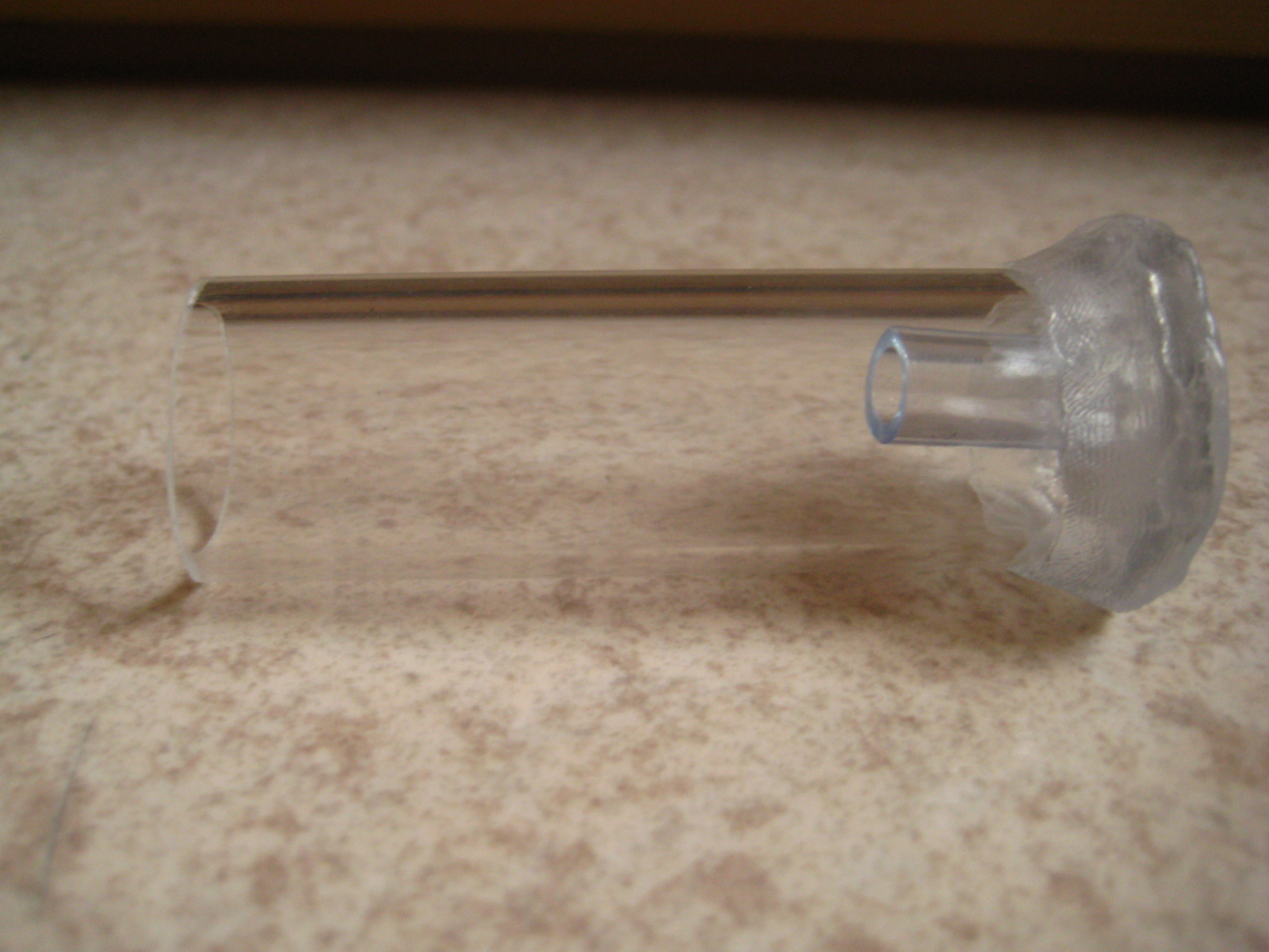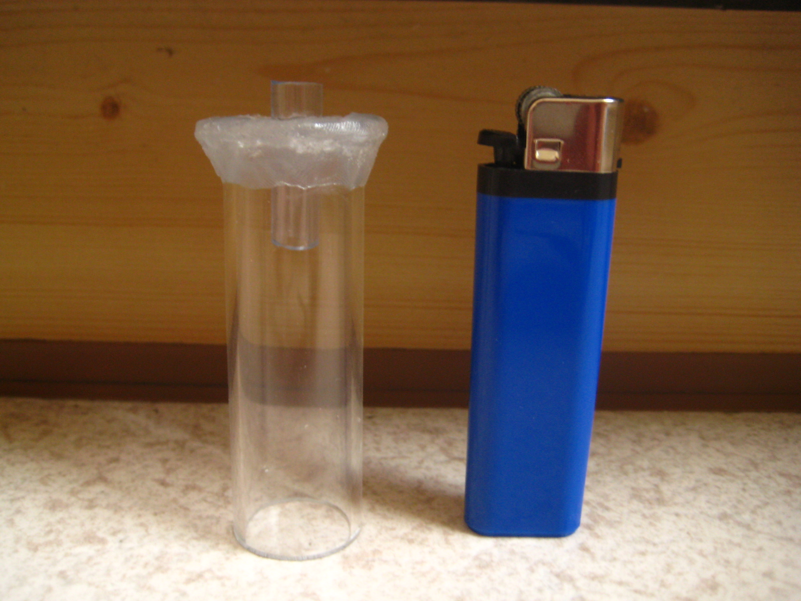 Mit einer Säge habe ich vorsichtig das 27mm Durchmesser Plexiglasrohr zersägt. Benötigen tue ich nur ein Feuerzeug großes Stück. Dieses habe ich auf einer Seite mit sehr feiner Gaze verschlossen, in dessen Mitte ich ein kleines Loch schnitt, durch das ich ein dünnen Schlauch von einem Innendurchmesser von 6mm und einer Wandstärke von 1,5mm durchsteckte.