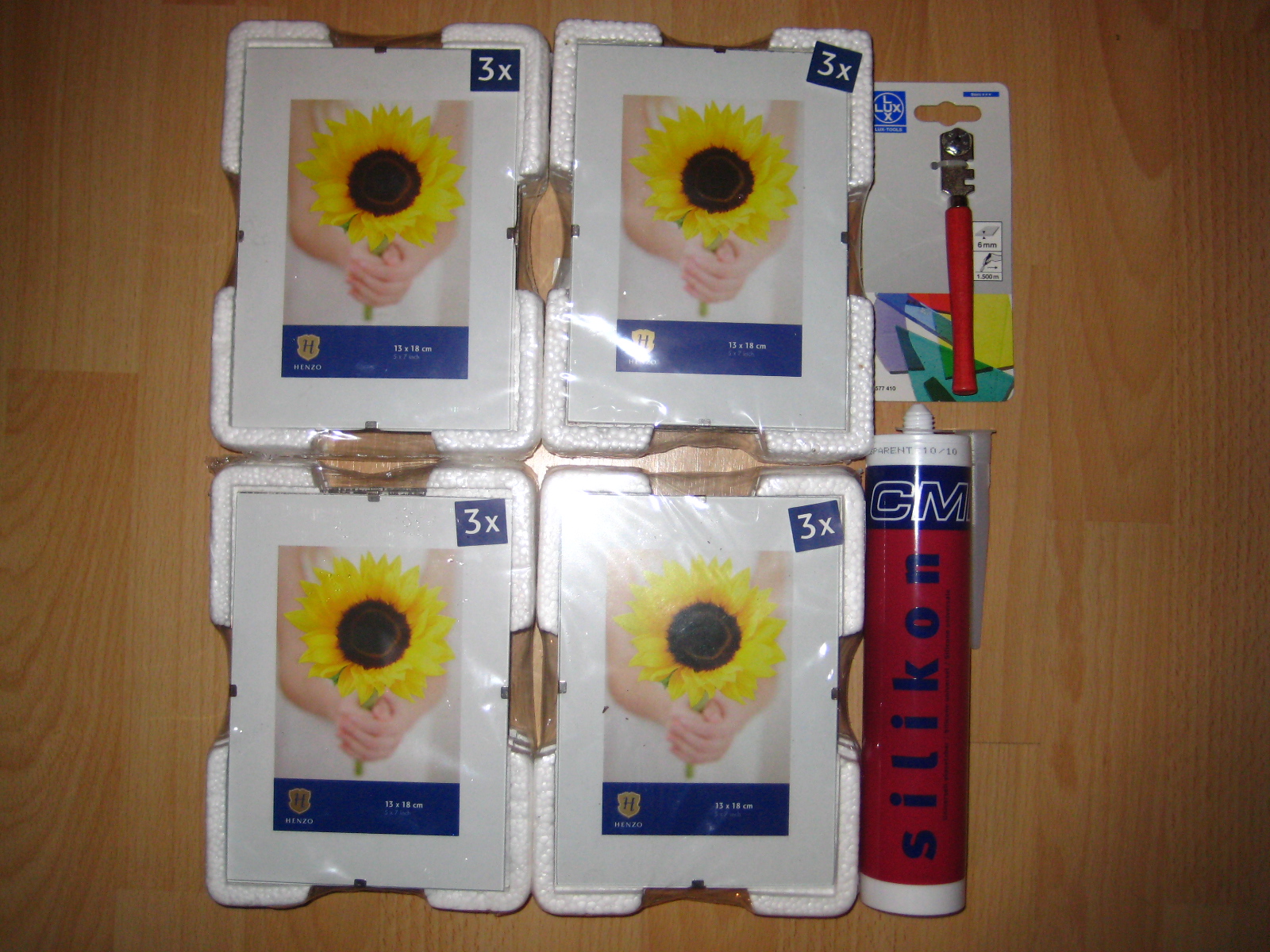 Der Glasschneider kostet gut 3€. Dieser fällt jedoch weg, wenn man bei Tedi die richtigen Größen an Bilderrahmen kauft, jedoch wäre es dann wiederum notwendig sich beim Glaser ein Loch bohren zu lassen. Ich wollte unbedingt wissen, wie gut man Glas mit solch einem Teil bearbeiten kann, also gekauft.