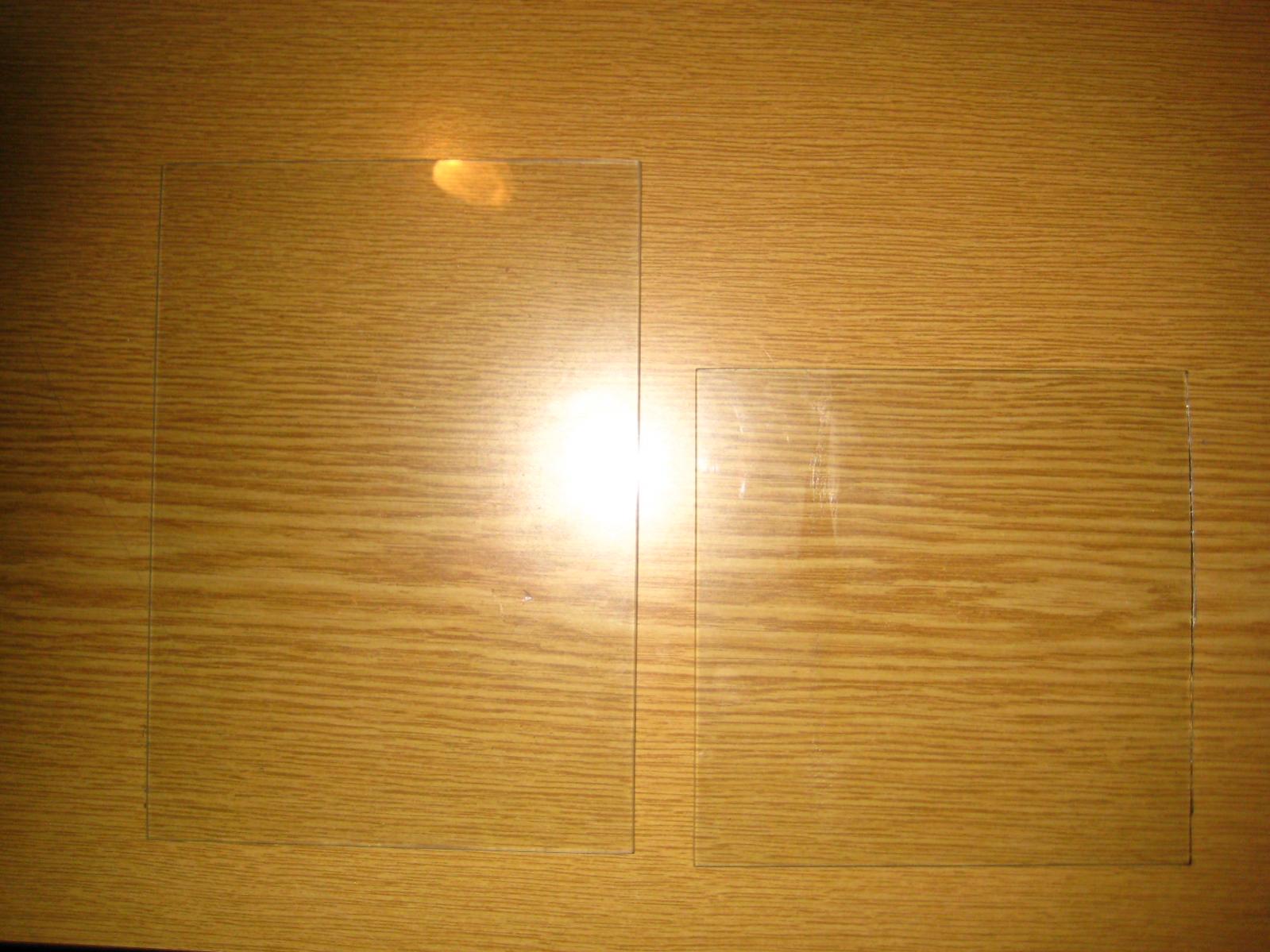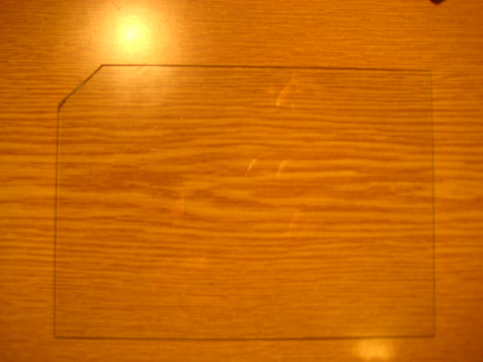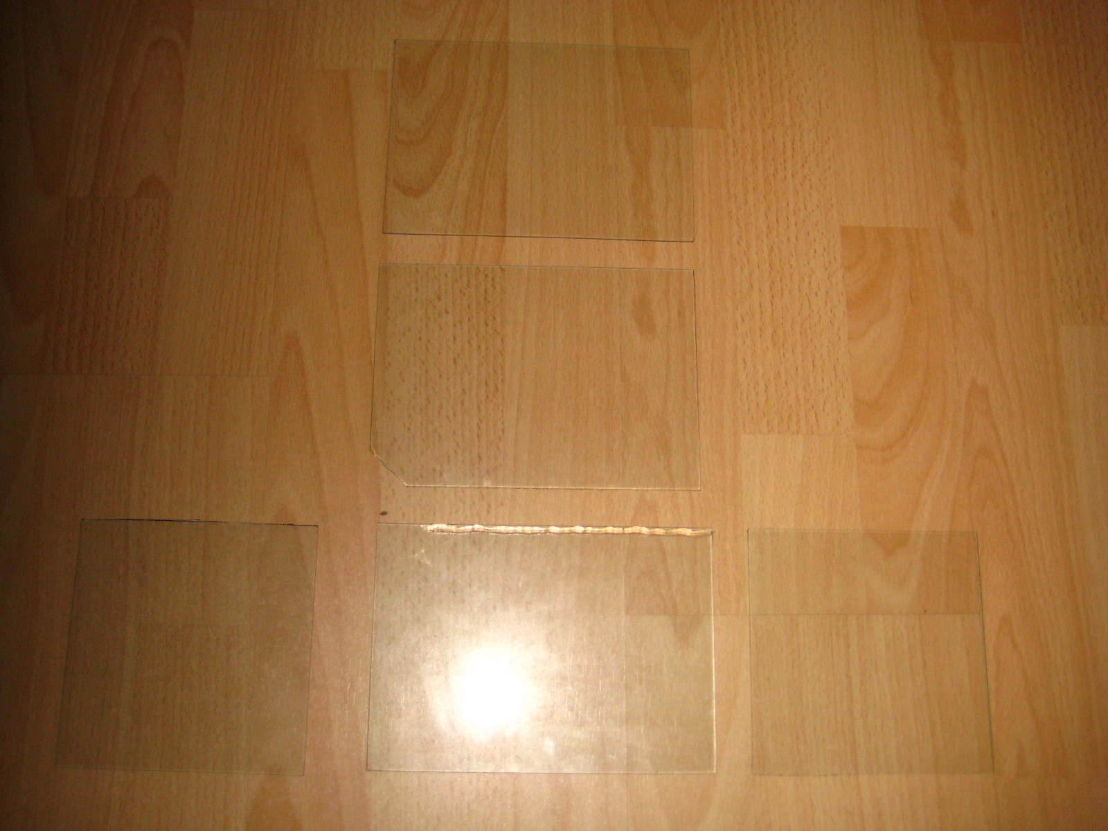 Noch schnell die beiden kurzen Seiten mit dem Glasschneider zugeschnitten. Einfach ausmessen, ein paar mal mit dem Glasschneider drüber gehen, mit der Schnittkannte auf z.B. die Schreibtisch Kannte legen und mit etwas Schwung auf das zubrechende Teil haun, schon fliegn die Löcher aus dem Käse und das gewünschte Maß sollte übrig bleiben und man erhält eine einigermaßen saubere Schnittkante: