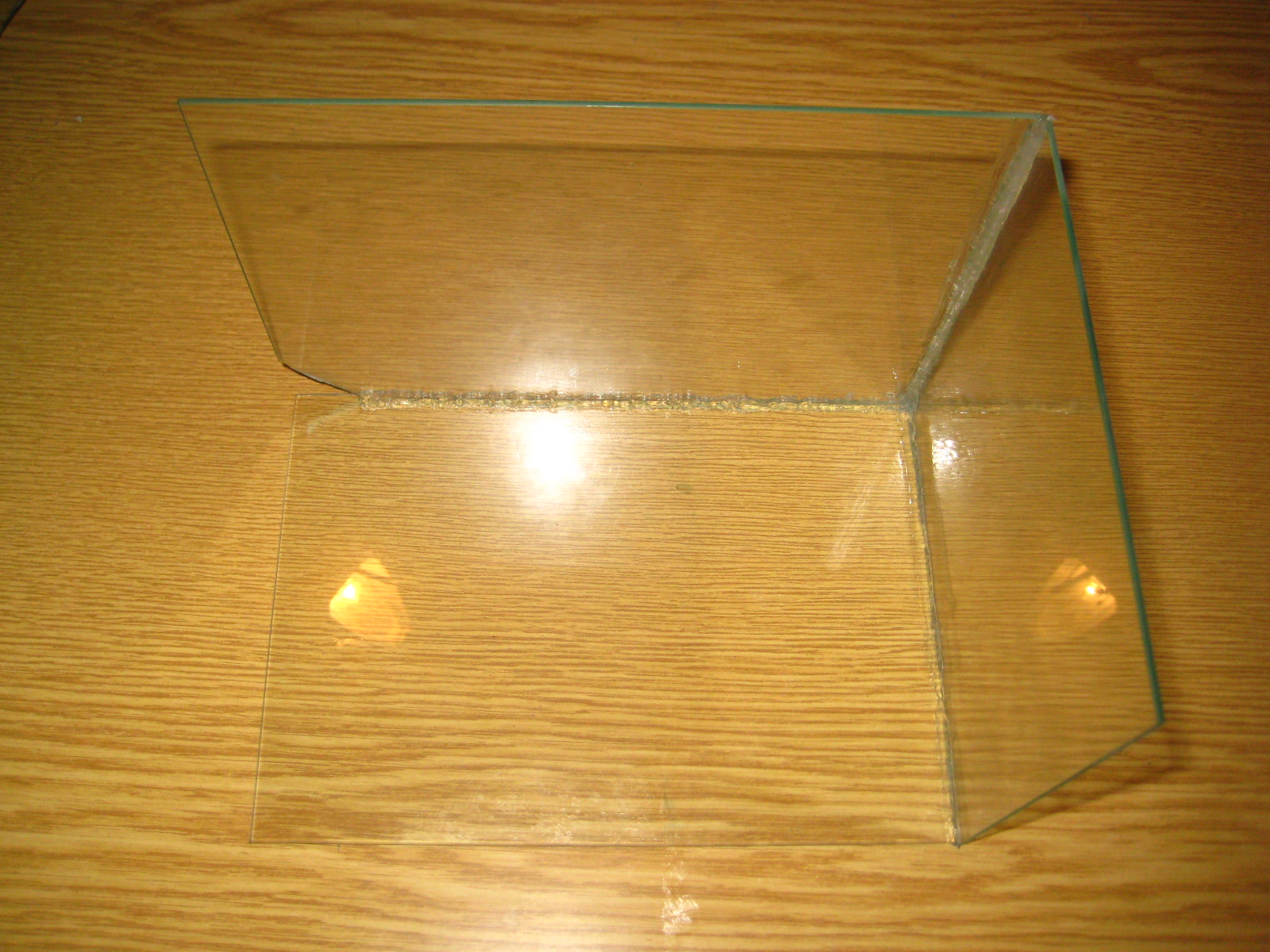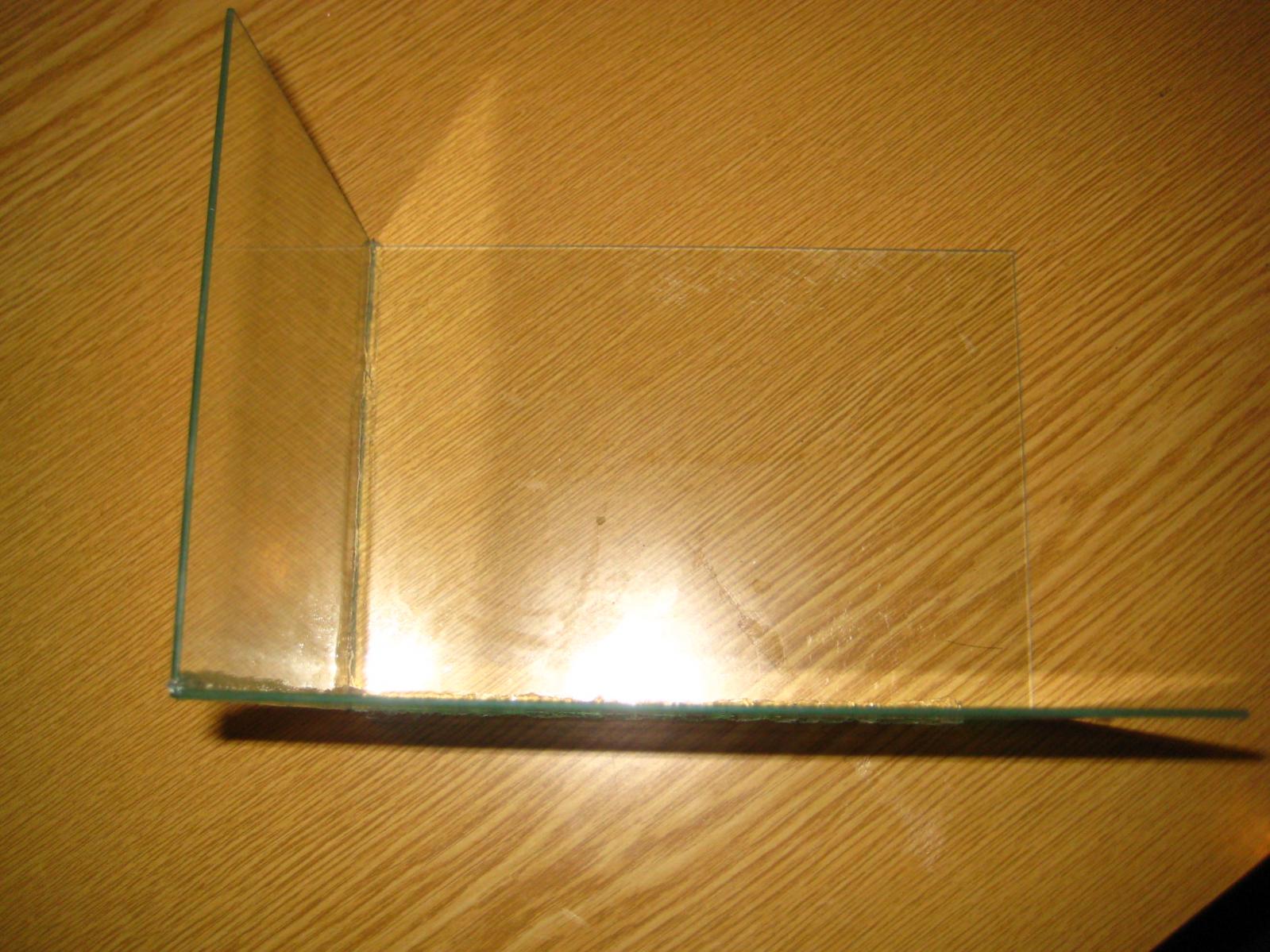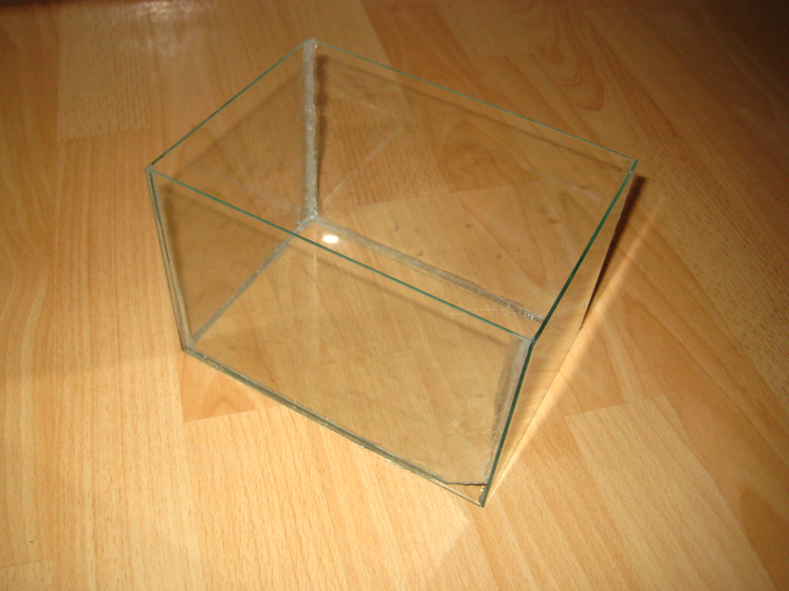 Bilderrahmen ausgepackt und alles ab in die Tonne, bis auf das Glas. Recht dünn, aber für die Größe des Beckens ausreichend. Jetzt kam die große Herausforderung, mit dem Glasschneider versuchen eine Rundung für die evtle. Erweiterung oder das Nest zu ritzen. Ich hab drei Glasscheiben ruiniert bevor ich aufgegeben habe. Das Problem ist, man bekommt das Stück nicht aus dem Glas hinaus, ohne das die dünne Scheibe bricht. Also habe ich einfach eine Ecke diagonal entfernt, fertig!