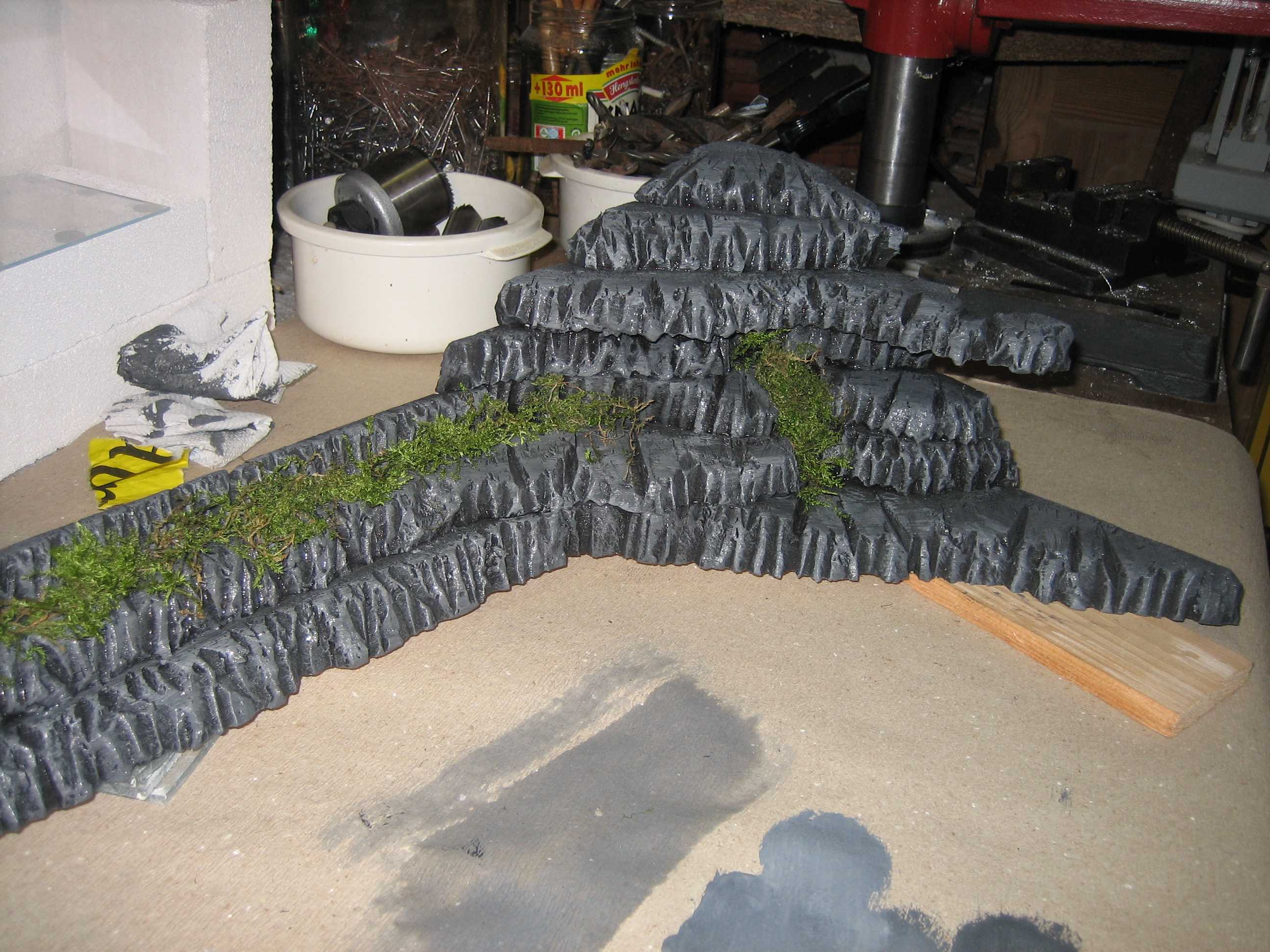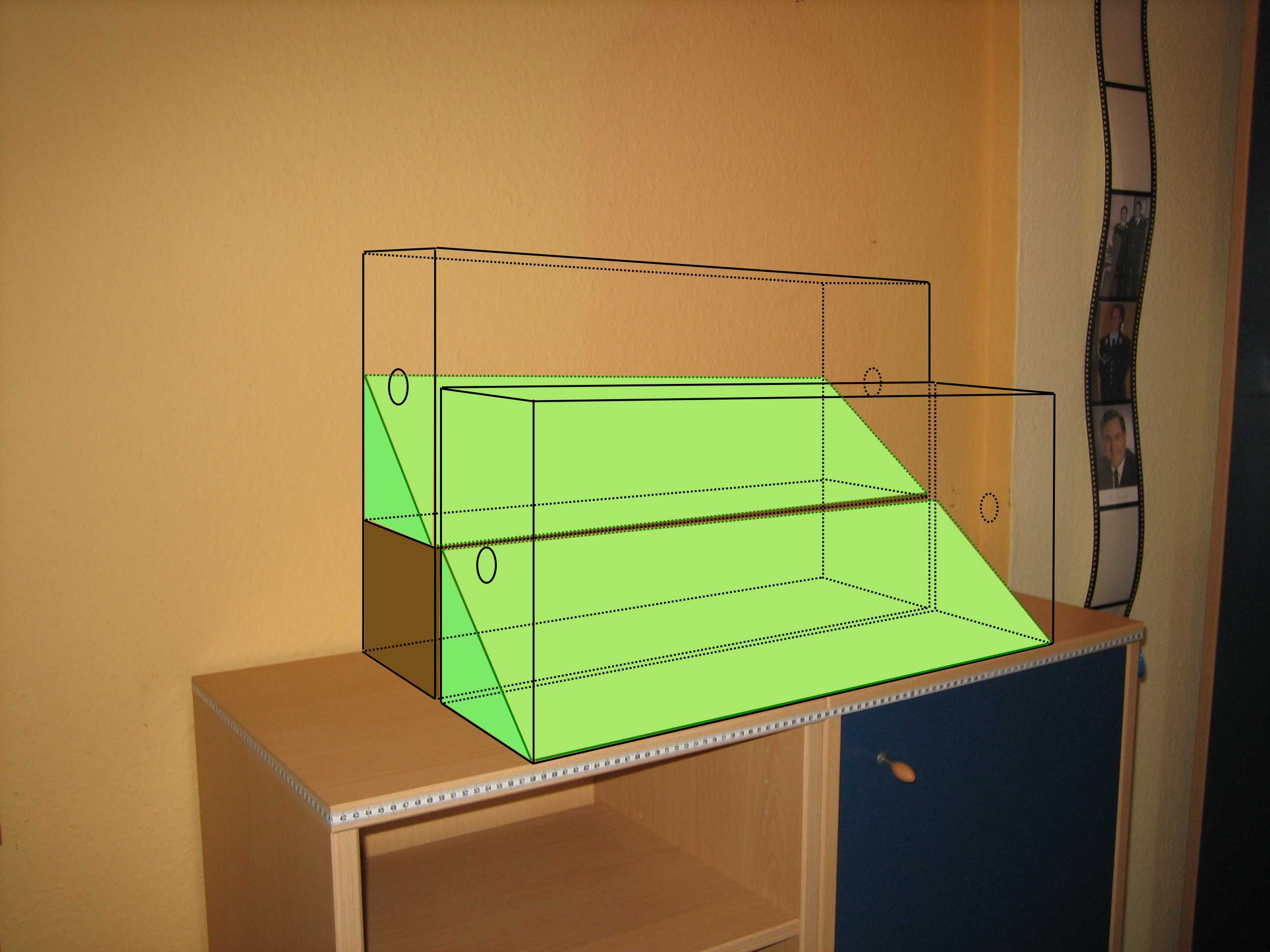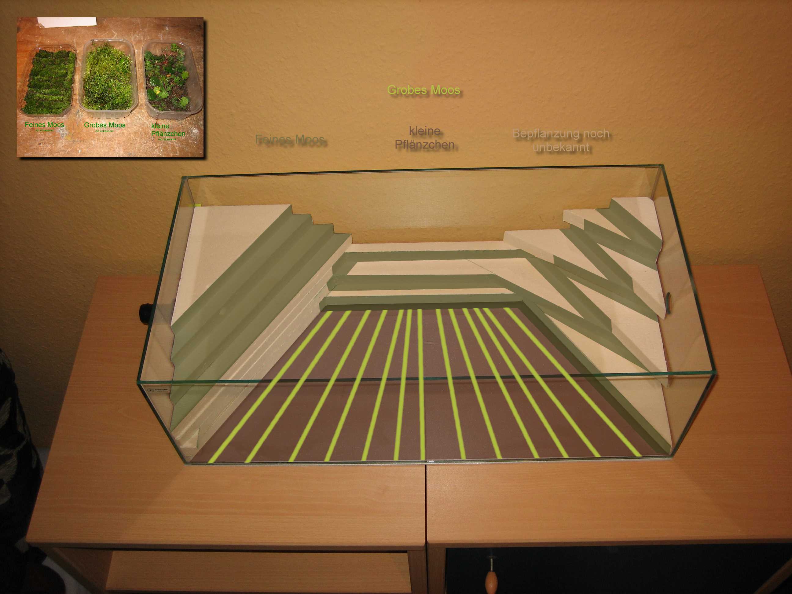 Zu sehen sind die zwei Becken (60x30x20cm) auf dem Schrank (Fläche = 95x40cm). Der braune Kasten unter dem hinteren Becken wird aus Holz angefertigt und dient als Auflage, um das Becken optisch an die Schräge anzupassen. Die grüne Schräge wird aus feinem Styropor gefertigt, auf dem der Waldboden modelliert wird. Die Schräge wird aus 1cm Schichten zusammengeklebt (siehe Skizze) und kann rundlich verlaufen, also nicht so abschüssig (zu vergleichen mit den Reisgärten in Asien).