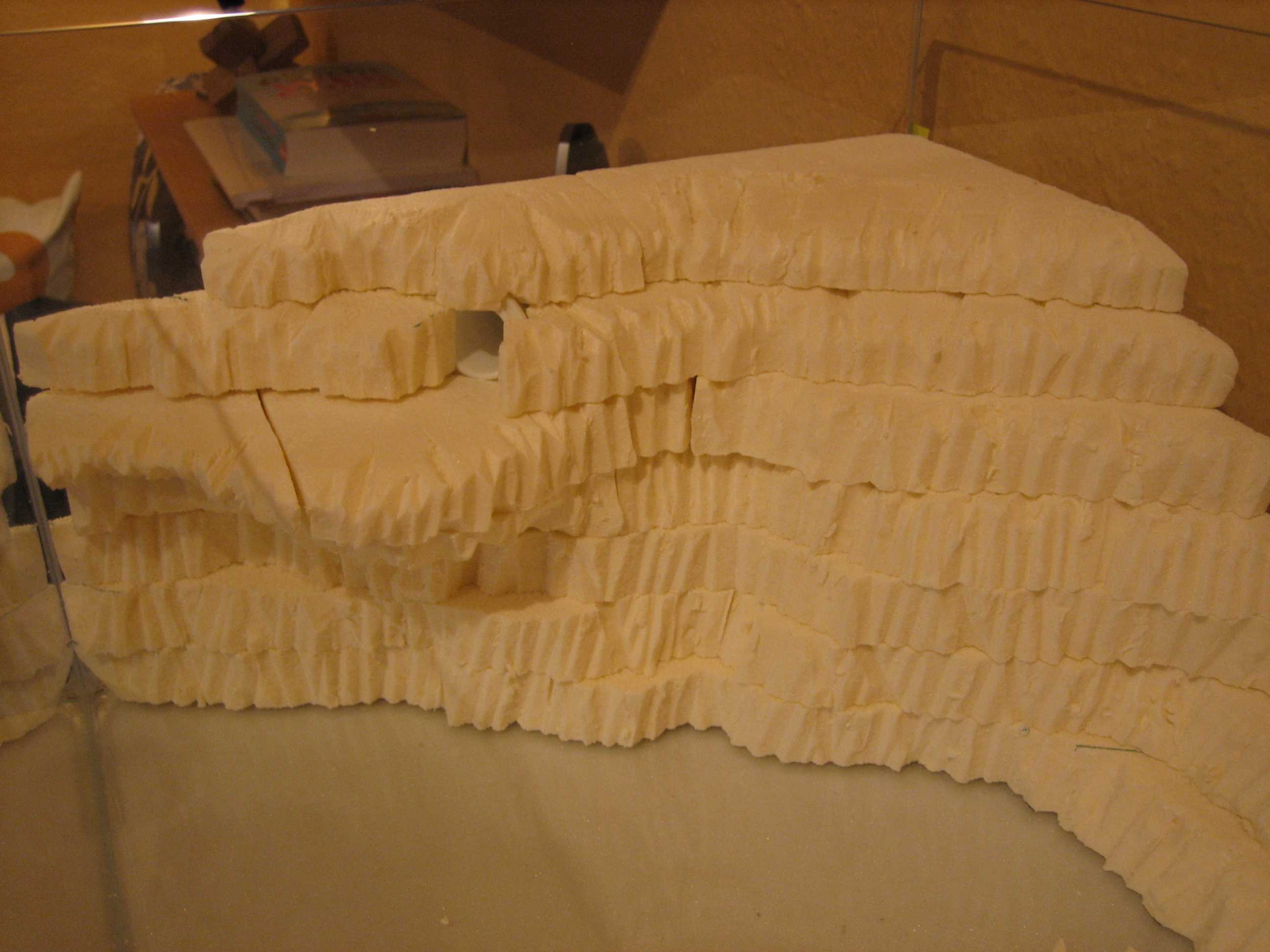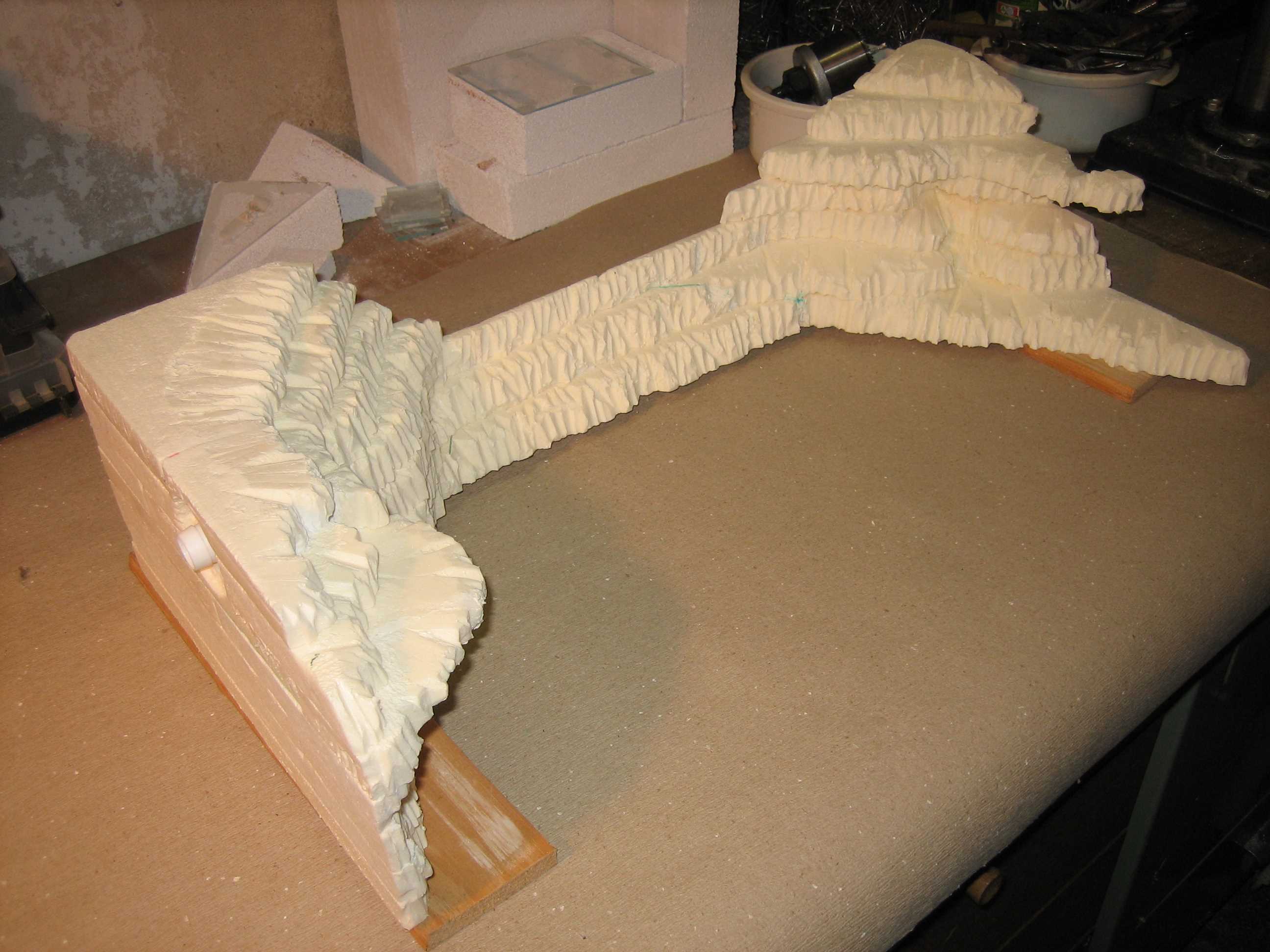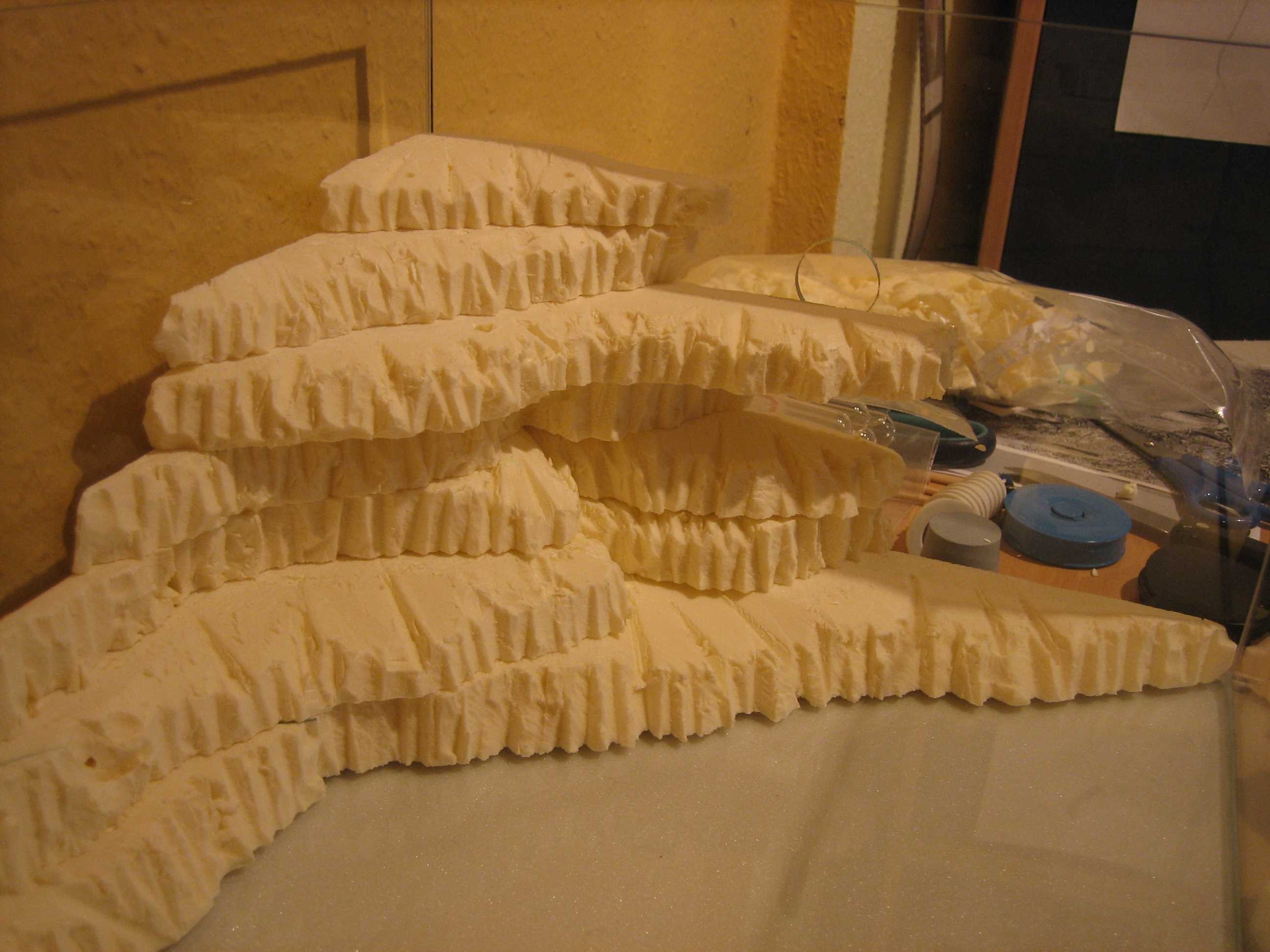 Zu sehen sind die zwei Becken (60x30x20cm) auf dem Schrank (Fläche = 95x40cm). Der braune Kasten unter dem hinteren Becken wird aus Holz angefertigt und dient als Auflage, um das Becken optisch an die Schräge anzupassen. Die grüne Schräge wird aus feinem Styropor gefertigt, auf dem der Waldboden modelliert wird. Die Schräge wird aus 1cm Schichten zusammengeklebt (siehe Skizze) und kann rundlich verlaufen, also nicht so abschüssig (zu vergleichen mit den Reisgärten in Asien).