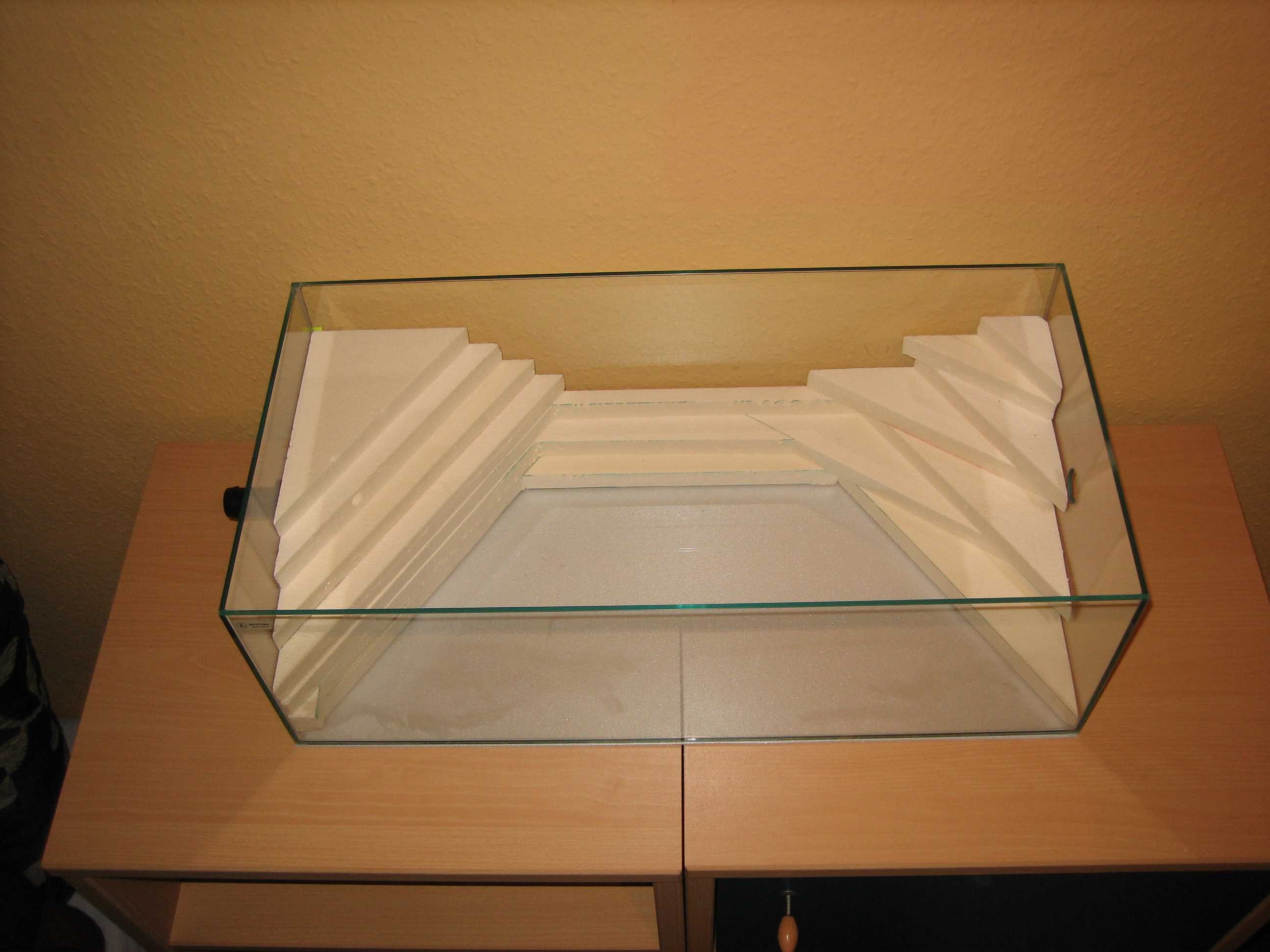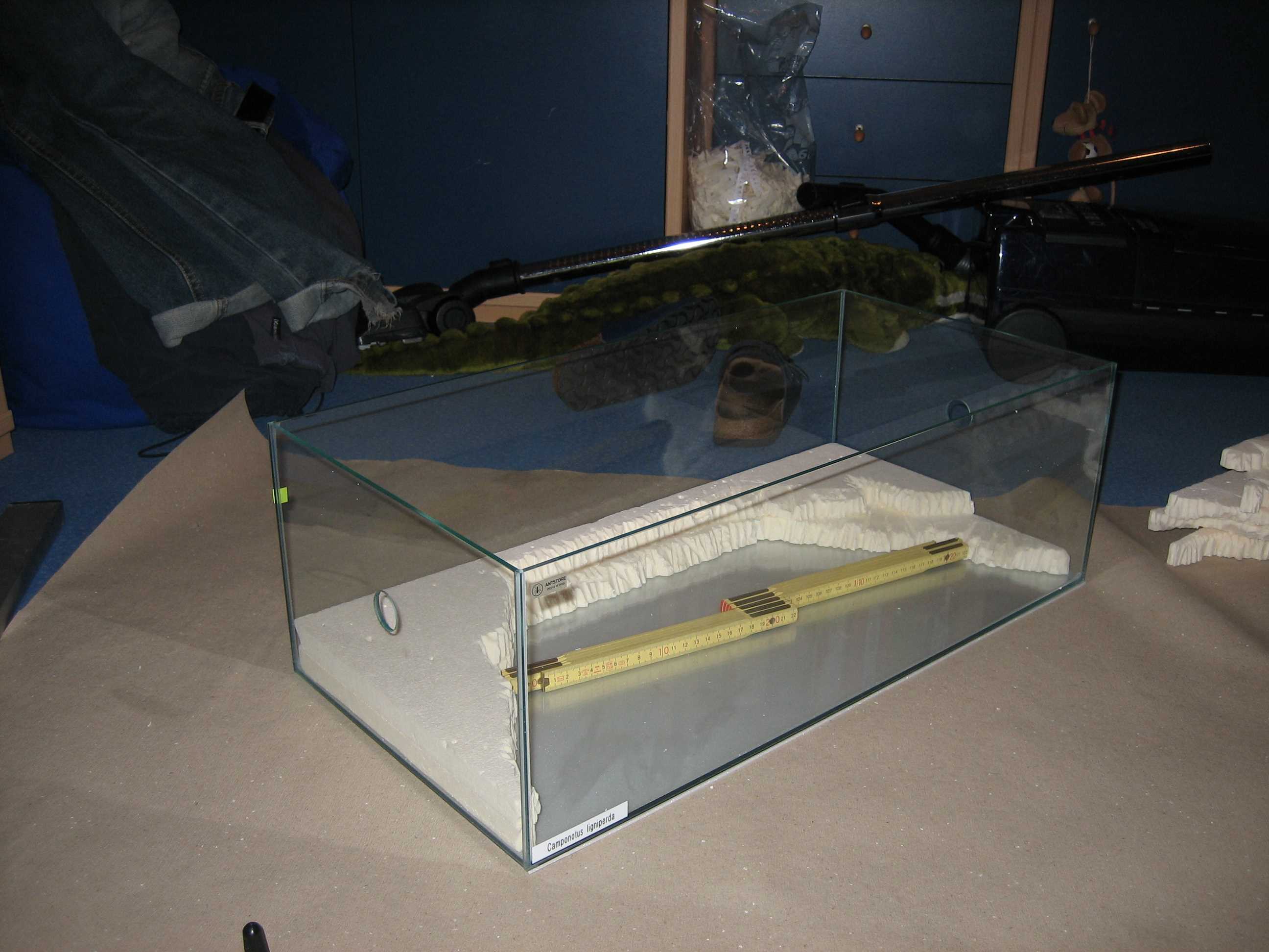 Es werden in den nächsten Tagen noch ein paar geometrische Formen in die digitale Schräge eingebaut, welche die Oberfläche nochmals vergrößern werden, um die Bewegungsfreiheit der Ameisen zu erweitern und um alles aus einem "so kleinen" Becken rauszuholen.