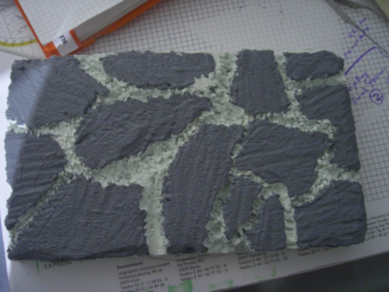 Also habe ich mit der Rückwand angefangen: Mit einem Schraubenzieher die Form reingemeiselt, dann die Lücken mit Hellgrauer Farbe und die Flächen mit Dunkelgrauer Abtönfarbe angemalt. Hier die Bilder: