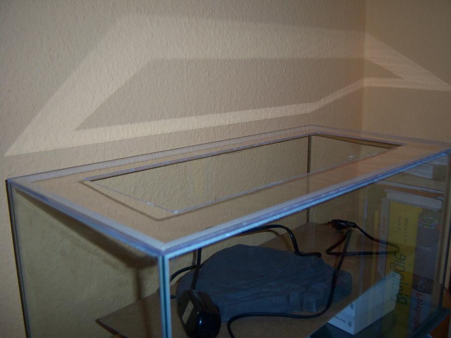 Somit wackelt nix und es ist auch alles dicht. Das Parafinöl kann ich jetzt auf der Unterseite des aufgelegten Plexirandes auftragen. Das Auftragen wird auch erleichtert, da ich den Rand einfach rausnehmen und flach hinlegen kann, also keine Gefahr das das Öl an der Scheibe runterlĂ€uft. NatĂŒrlich noch das wichtigste fĂŒr mich: ich habe keine beschmierten SeitenwĂ€nde, die die Optik beeintrĂ€chtigen.