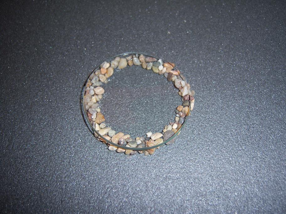 Hab ganz einfach auf einem StĂŒck Folie den Umfang des Uhrenglases abgezeichnet und dann mit Silikon nachgezogen. Danach einfach mit Kies ĂŒberstreut und trocknen lassen.