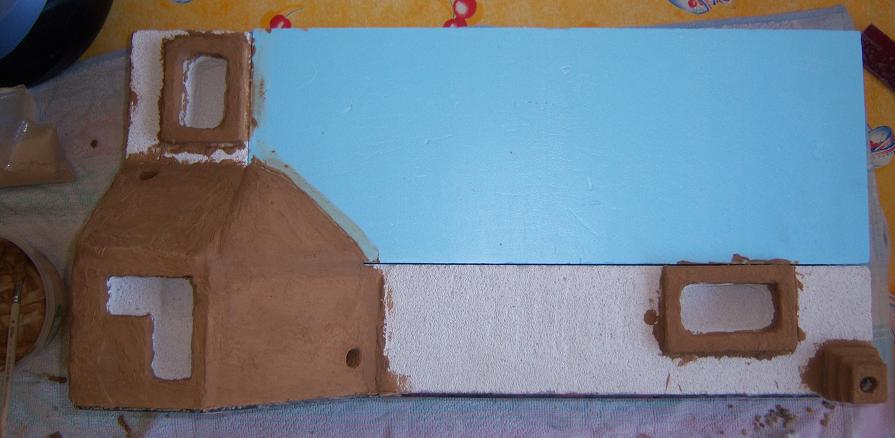 Nachdem der Kleber etwas ausgehĂ€rtet war ging es nun daran etwas Farbe ins Spiel zu bringen. Also her mit dem Lehm etwas Wasser dazu, sodass es eine dickflĂŒssige Masse ist und dann alles anpinseln was spĂ€ter nicht von Bodengrund bedeckt ist.