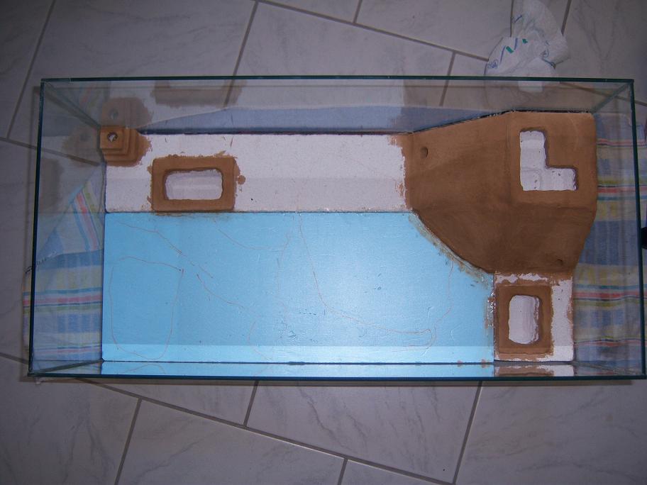 Heizstein rein und Kabel verlegen. Den einen Teil im Styrodur versenkt und mit Isoband befestigt. Da ich kein Loch ins Glas schneiden wollte muss das Kaben halt ĂŒber den Rand. Damit es nicht ganz so sch... aussieht wenn da einfach so ein Kabel hochgeht, habe ich Aquaristikrohr (nicht Schlauch) besorgt und ihn in der HĂ€lfte geteilt. Dann noch mit ordentlich Aquariensilikon ausgefĂŒllt und ab damit ĂŒber das Kabel, was bereits mit doppelseitigem Klebeband an der Scheibe fixiert war. Noch ein kleines Loch in die Randplatte und ausbruchssicher ist das Ganze^^