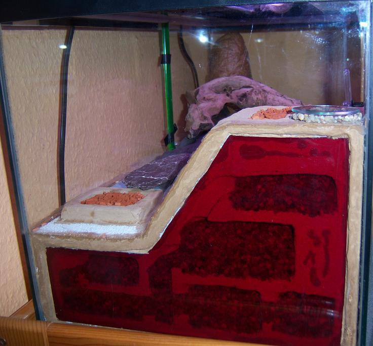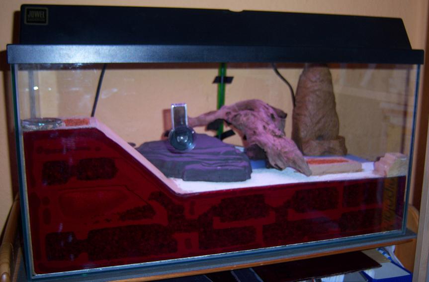 Hmm irgendwas fehlt noch??? Ach ja FotorĂŒckwand und natĂŒrlich Bodengrund. Der Bodengrund besteht aus Sand-Lehmmischung, verschiedene Körnungen Kies und etwas Seramis war halt noch vom BefĂŒllen der Wassertanks ĂŒbrig. Höhe des Bodengrundes 1-2cm. unter dem Heizstein ist kein Bodengrund, nicht das sie doch versuchen da zu buddeln, weil es so schön warm ist.