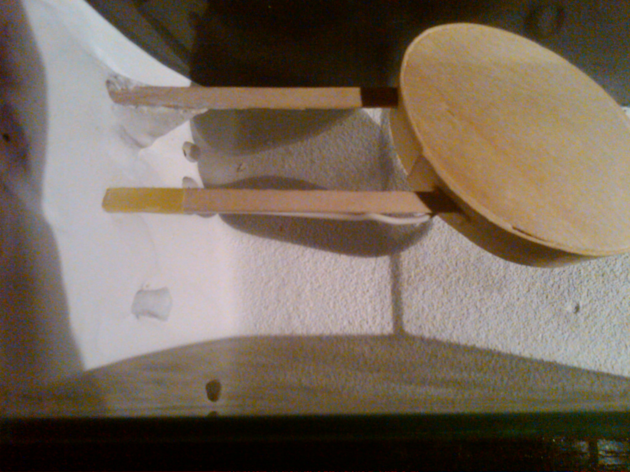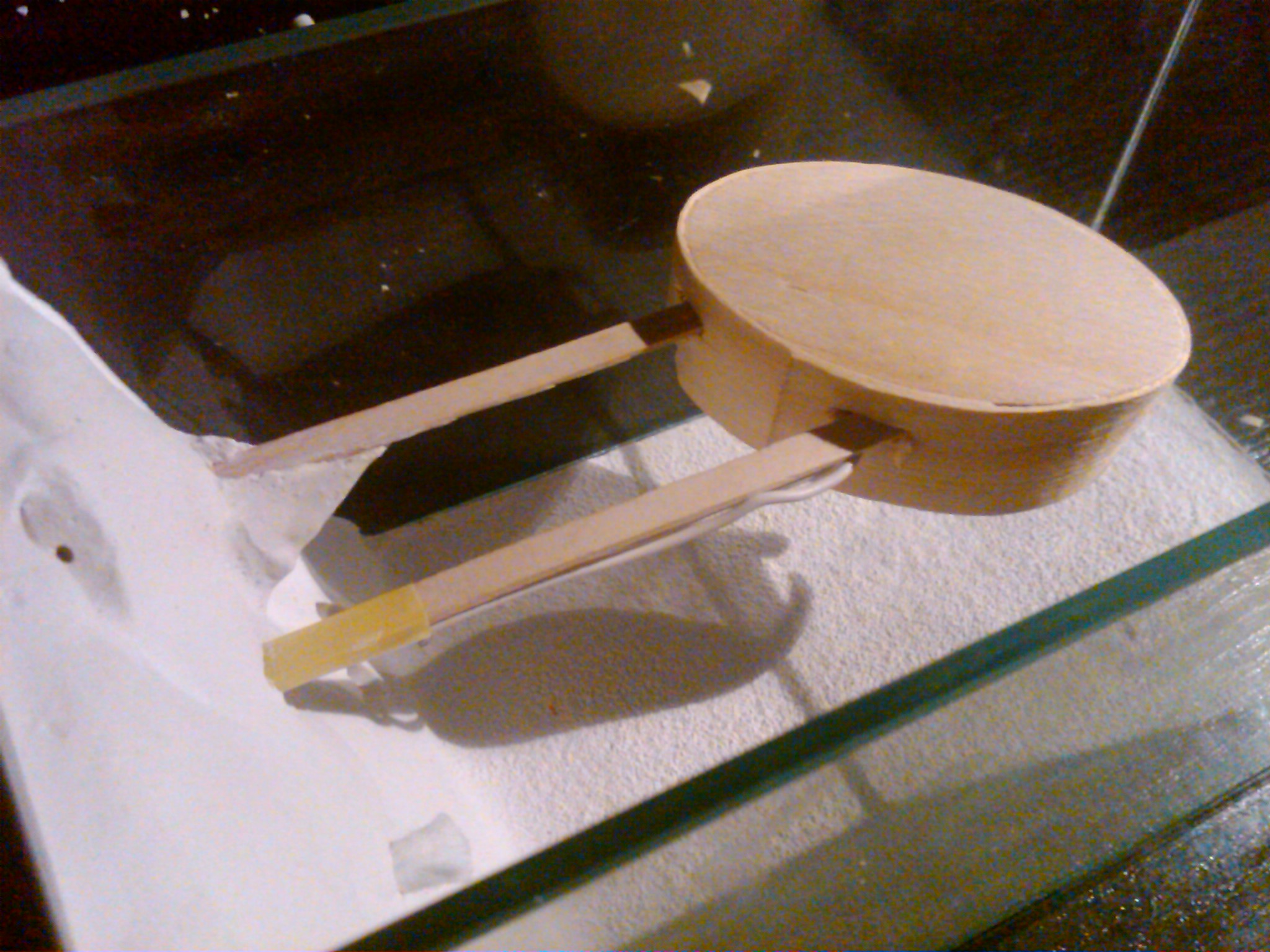 Sowohl in den mittleren Plastikhalm (ich schreib's jetzt einfach richtig) und in das rĂŒckwĂ€rtige Loch zur Kammer links oben habe ich nun die Stöckchen der Burgerkette eingefĂŒhrt um den TrĂ€ger der Flutlichtanlage zu bekommen. Die Kabel werden unter einem der Stöcken entlag gefĂŒhrt.