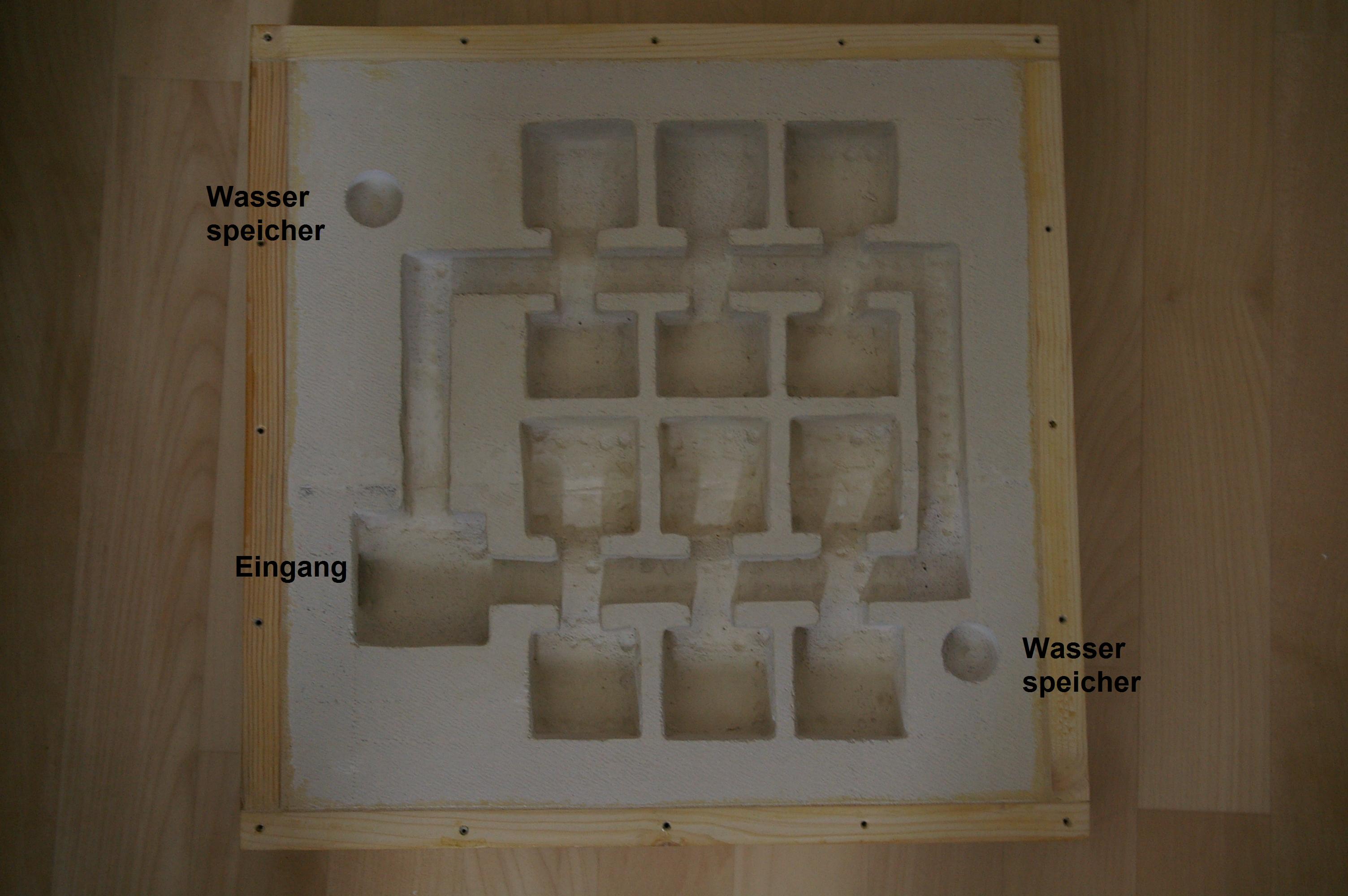 Du musst mit einem Schwung genug Wasser in die Tanks bekommen, um mind 1/3 der Kammern zu befeuchten Schraegstrich feucht zu halten. Ich glaube, dass wird mit den Bohrungen nix... aber probiere es aus, die Feuchte erkennst Du an der grauen Farbe des Porenbetons. Dann nach und nach die Wassertanks vergroessern, bis Du endlich genug Wasser einfuellen kannst, um ein paar Kammern feucht zu halten. Ist der Tank zu gross, fuellst Du halt etwas weniger Wasser ein... ist der Tank aber zu klein, rennst Du im Sommer wie bloede alle Stunde mit nem Eimer durch die Huette.