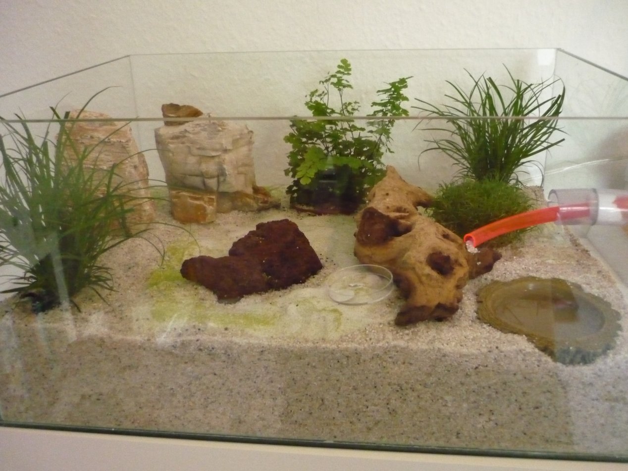 [/font] [font=Arial]Nach Einsetzen der genannten Dinge und der Wasserstelle habe ich abschließend alle verbleibenden, kleinen Hohlräume und Ränder der Arena mit Aquarienkies aufgefüllt. Der Kies in der Arena sollte besonders in der Startphase nicht befeuchtet werden, sonst kommt die