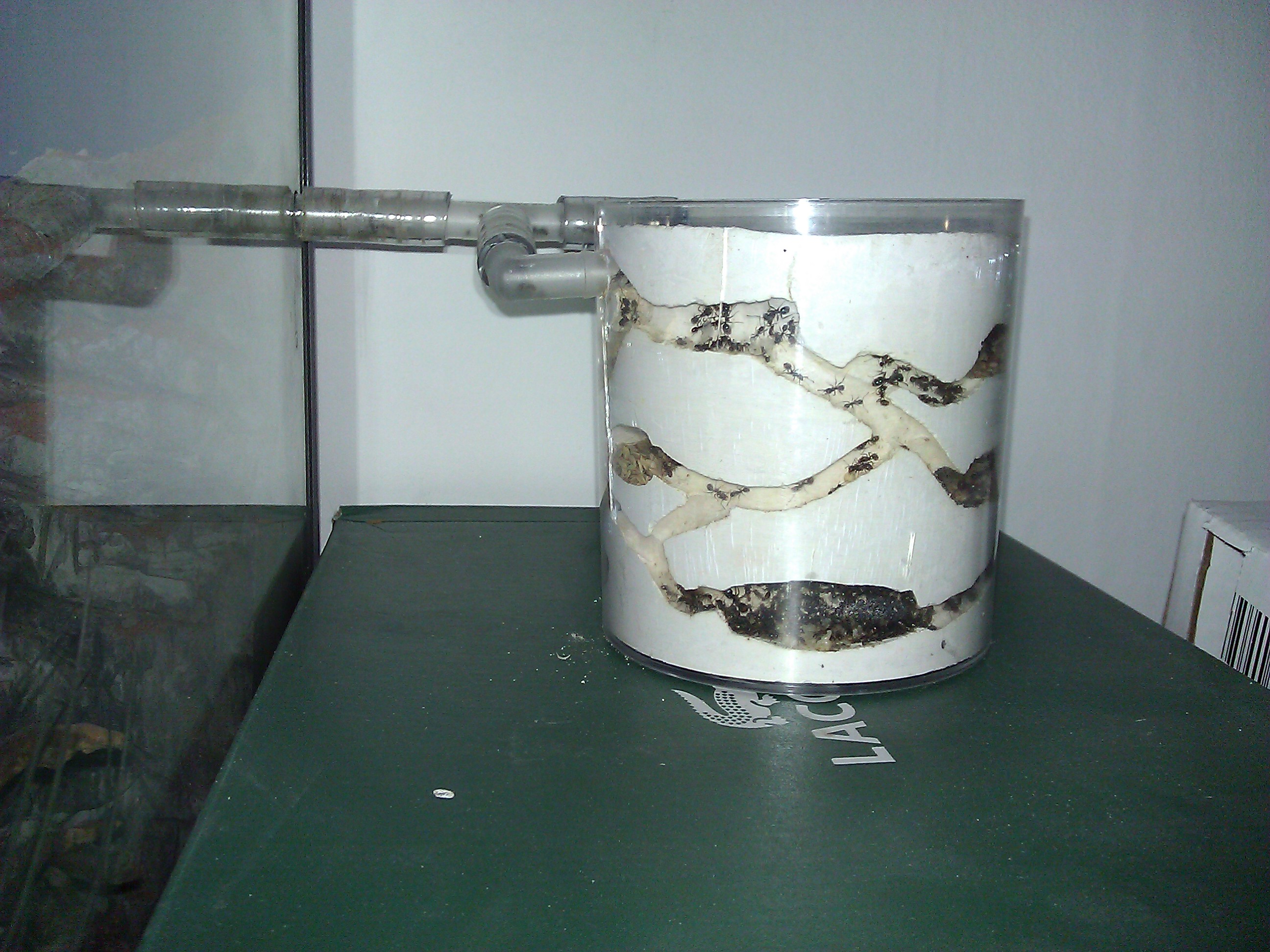 Ăber die LuftdurchlĂ€ssigkeit im Gips kann ich noch nichts negatives berichten, denn Schimmel oder Ă€hnliches hatte ich noch keinen. Liegt vielleicht daran dass die Messor-Arten allg. sehr reinlich sind im Nestbereich, aber auch weil ich nur dann Insekten verfĂŒttere, wenn ich gerade eins zerschlagen habe (meistens Fliegen). Und somit auch nie Leichenteile irgendwo gelagert werden. Deswegen ist es mir sehr wichtig bei meinem neuen Nest Absperrmechanismen einzubauen. Wenn sie einmal eingezogen sind werden ich keine Möglichkeit haben es zu öffnen ohne der Kolonie massiv zu schaden.