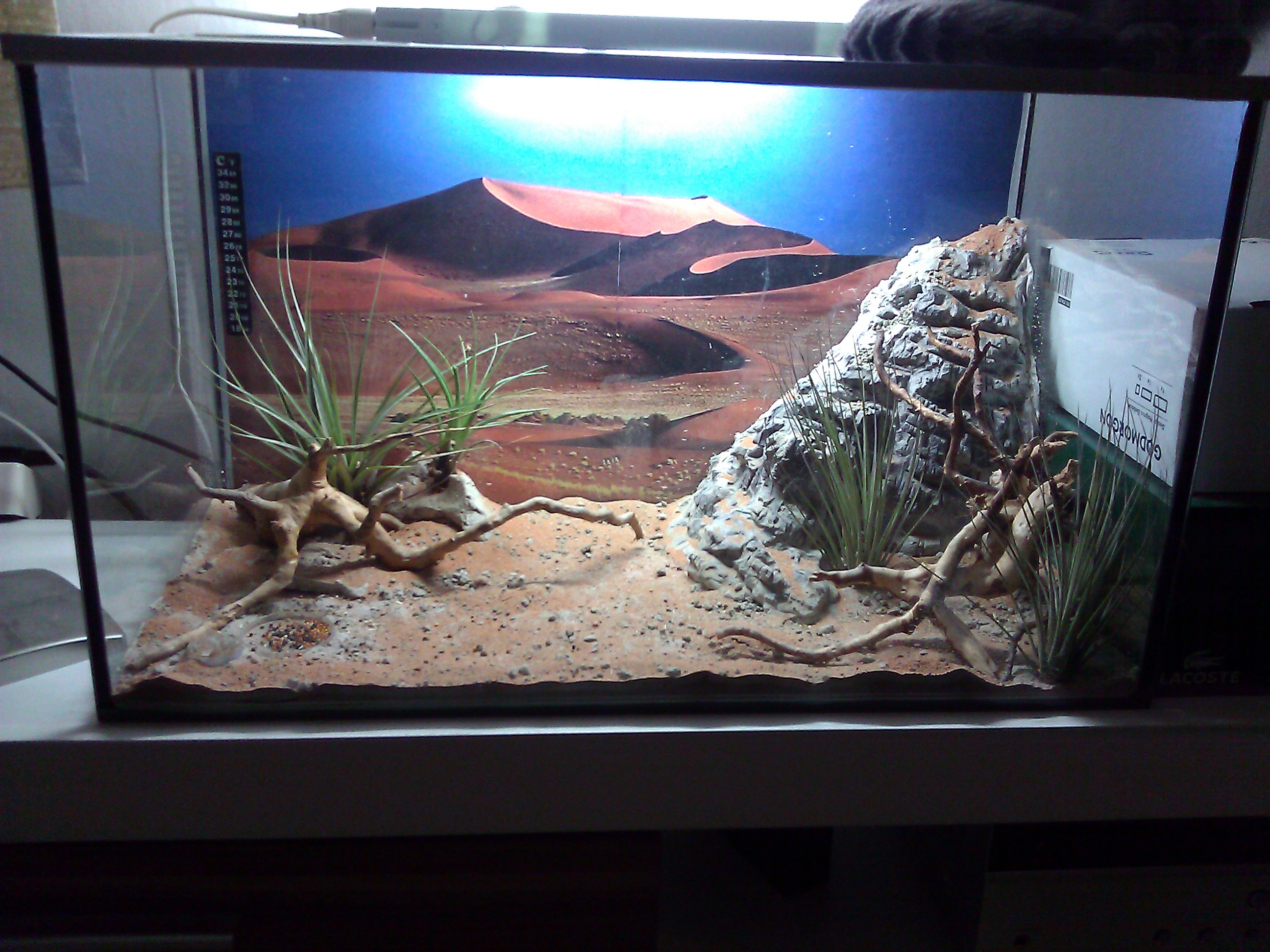 Und dann noch ein kleines Foto zu meiner Arena sowie mein selbstgebastelter Felsen, wo oben ein Verbindungsdurchgang zu meinem externen Nest eingebaut ist. (Das Foto von der WassersÀule ist nicht das original sondern nur ein Symbolfoto)