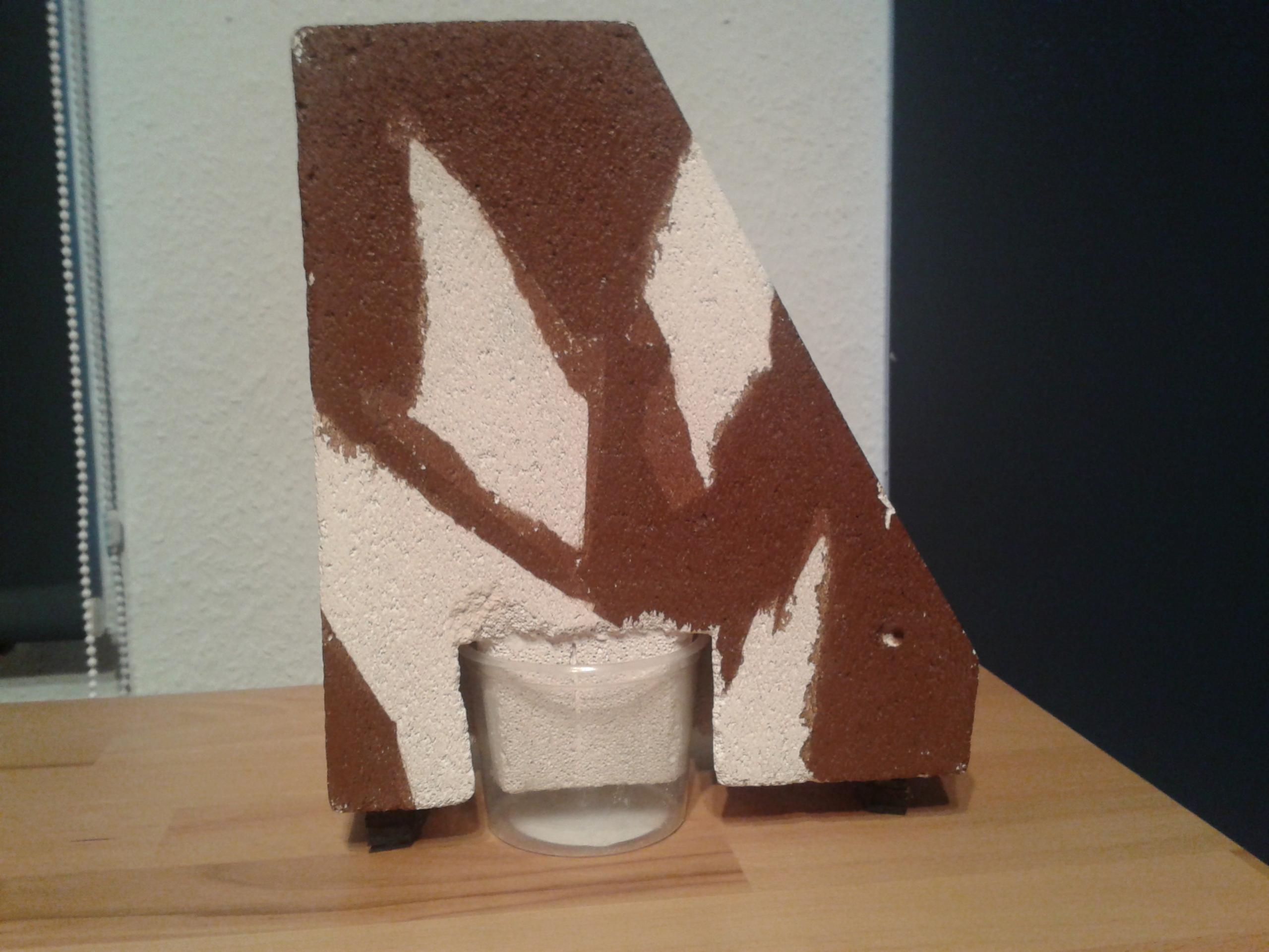 Zur Bewässerung habe ich an der Hinterseite vom Nest eine Aussparung gesägt. Dort stelle ich einen Plastikbecher mit Wasser auf, wodurch eine konstante aber "unsichtbare" Bewässerung ermöglicht wird. Die unteren Kammern sind näher an der feuchten Stelle und sollten daher mehr Feuchtigkeit aufweisen als die oberen Kammern.
