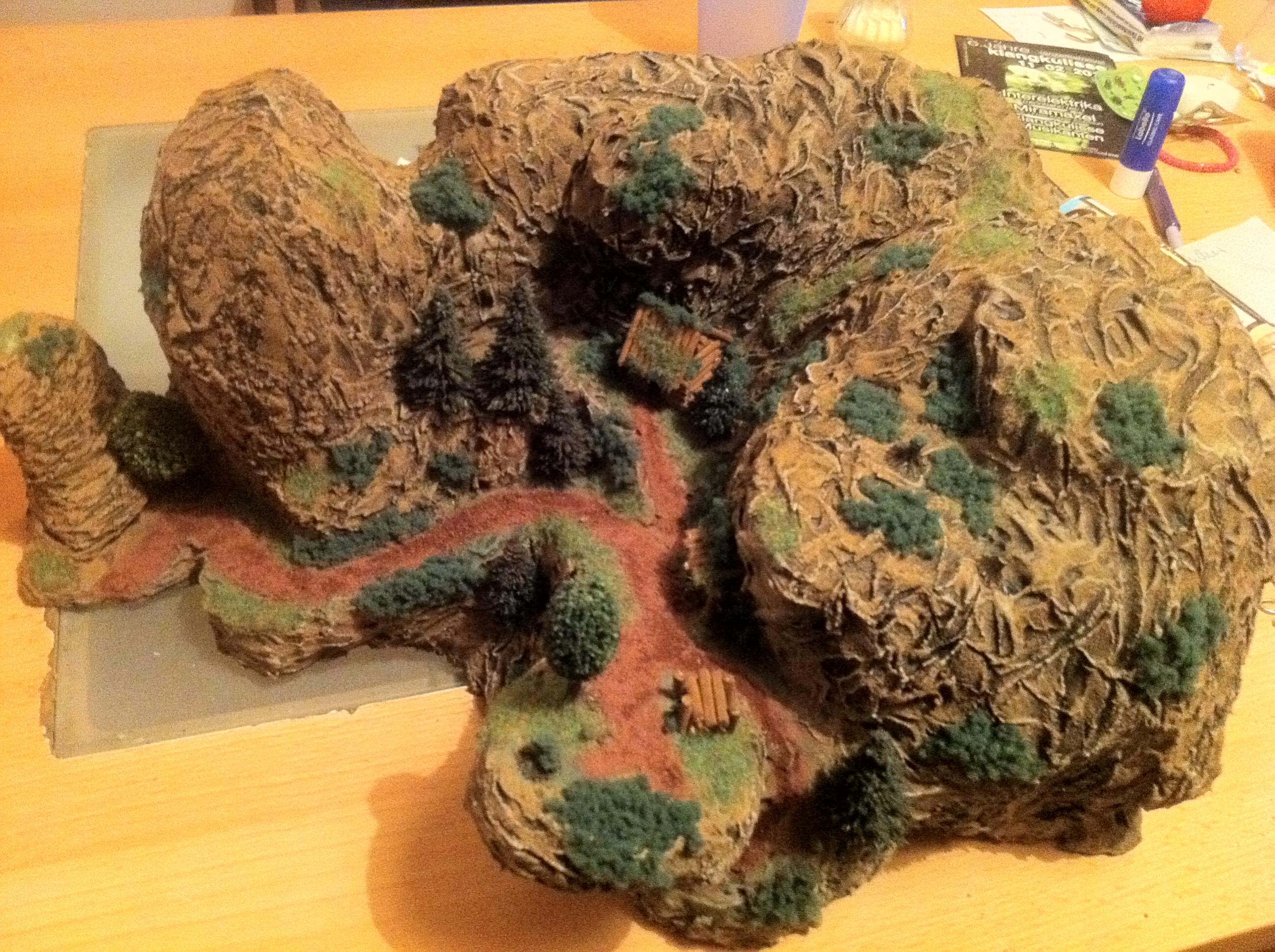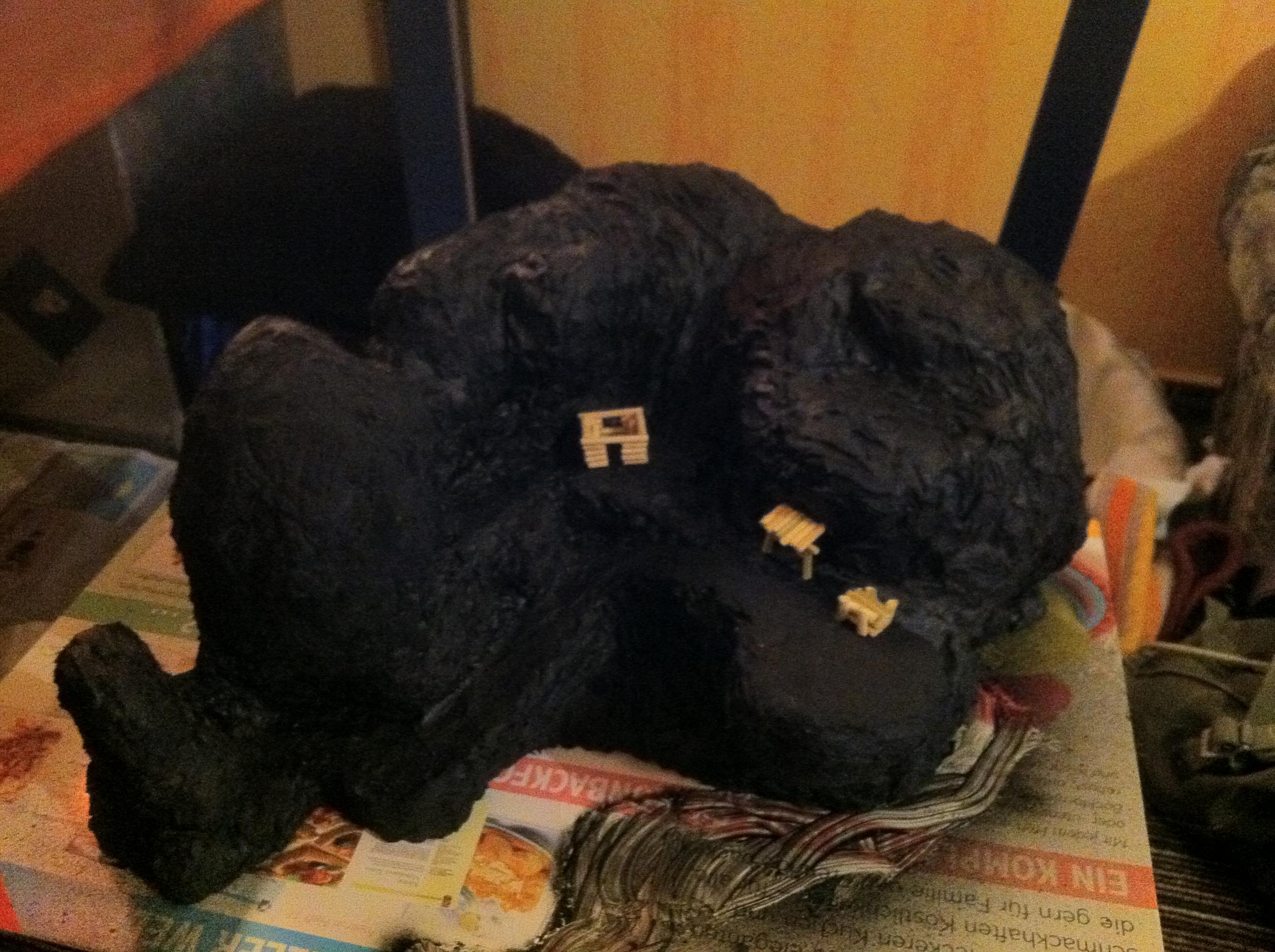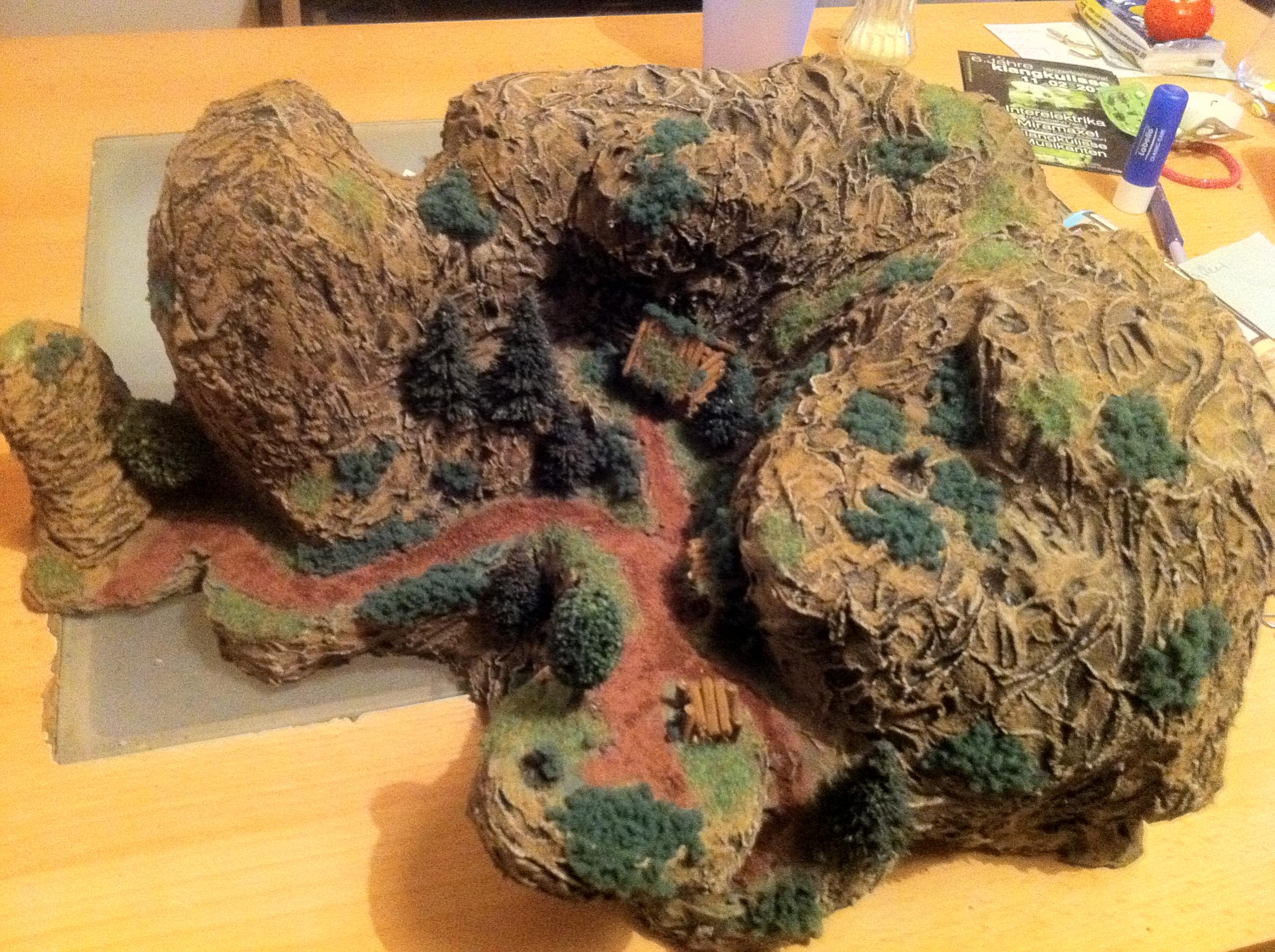 Grob die Felsen rausgearbeitet und das ganze mit Flexifliesenkleber verspachtelt.