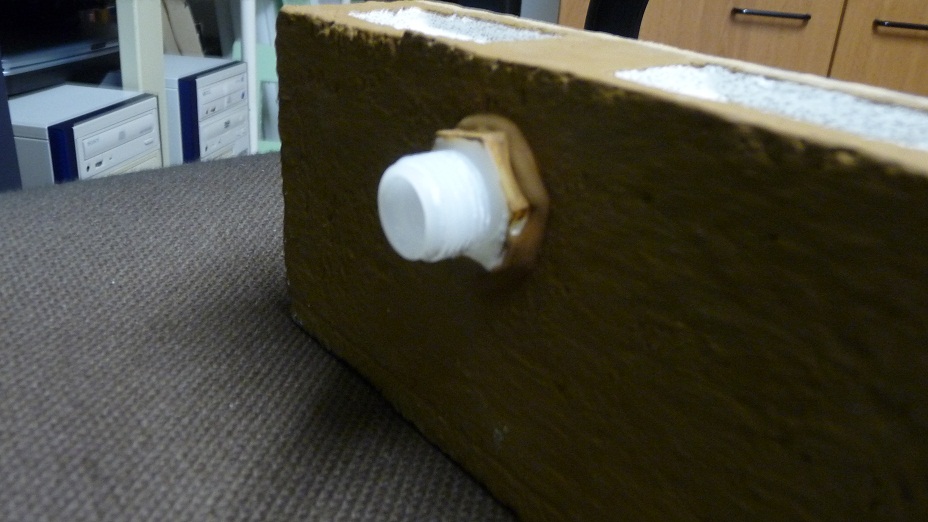 Der Anschluss erfolgt ĂŒber einen antstore-ĂŒblichen Beckenverbinder, den ich mit der geriffelten "Schlauchseite" in den Klotz einfĂŒgte. Durch das ausarbeiten eines geringfĂŒgig gröĂeren Loches und das Bestreichen der geriffelten, lĂ€ngeren Seite des Beckenverbinders mit Modellgiergips ergibt sich eine rundum dichte Verbindung mit dem Ytong, die durch die LĂ€nge der "Schlauchseite" und von deren "Widerhaken" profitiert!
