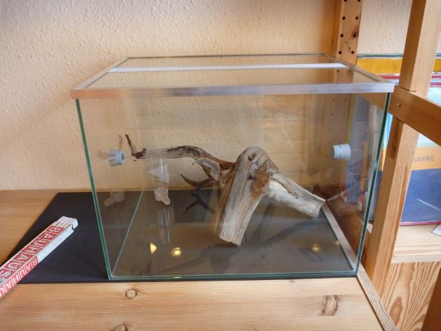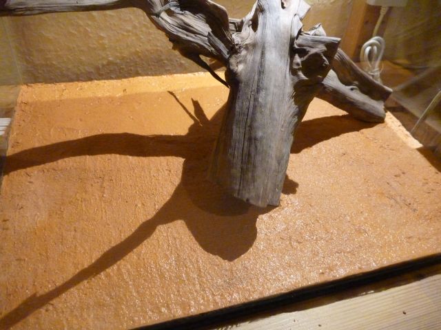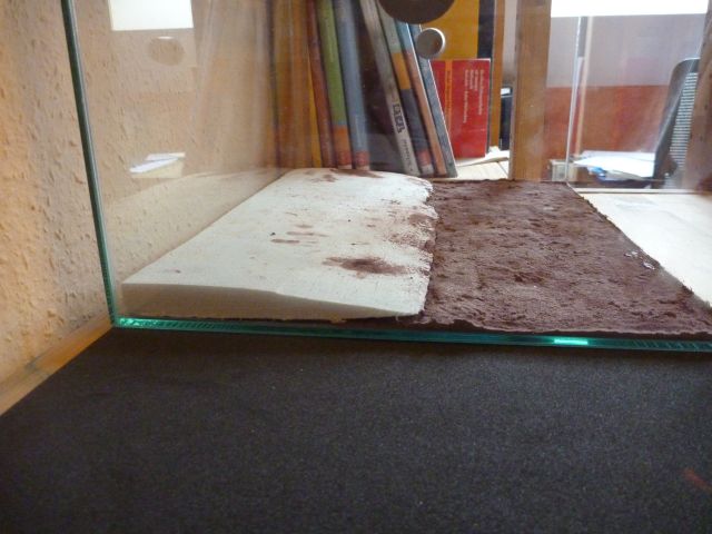 )Da ich jetzt das Problem hatte, dass ich den Deckel aufrgrund des Kabels nicht mehr so einfacht irgendwo ablegen konnte, habe ich an der Holzplatte des Regals ĂŒber dem Glasbecken eine Halterung angebracht, in der ich den Deckel befestigen kann. Als nĂ€chstes folgte dann die zweite Bodengrundschicht in orange (ocker).