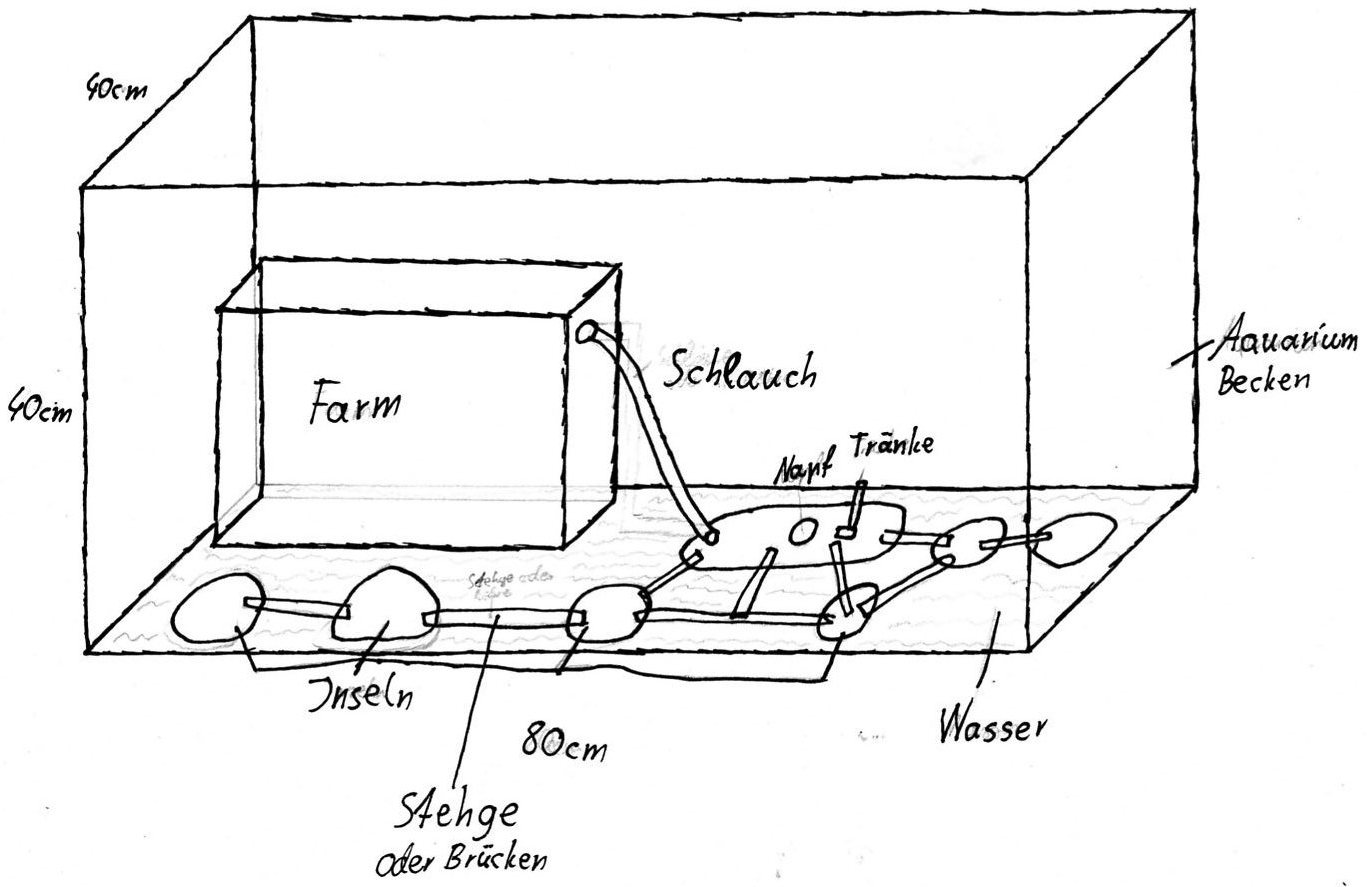 [font="]Anmerkung 1: Wenn du dies in der Form durchfĂŒhren möchtest, dann sollte der Mittelteil des Schlauches, welcher aus der Farm fĂŒhrt unterhalb des Wasserspiegels verlaufen, sonst klettern sie dir am Schlauch entlang raus und das ganze „Inselprojekt wĂŒrde ad absurdum gefĂŒhrt werden.[/font]