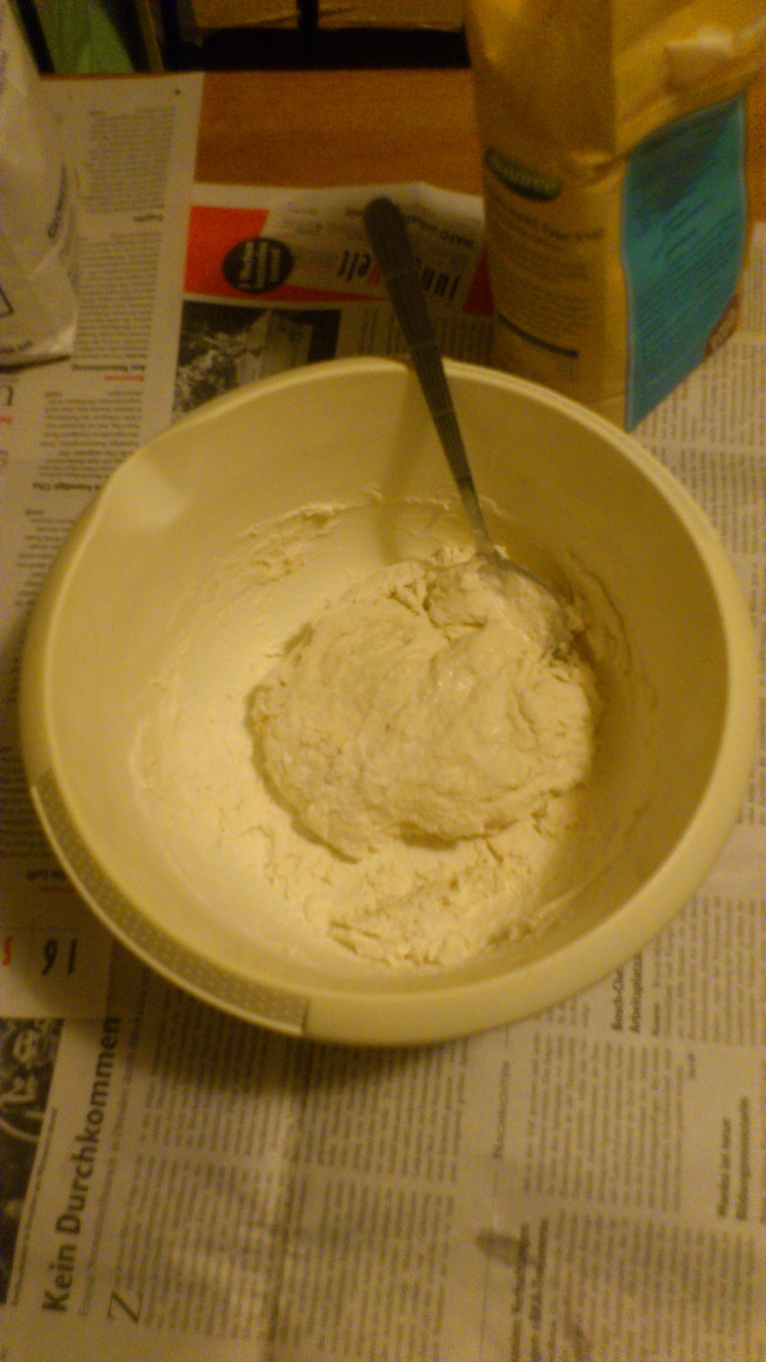 Das Mehl mit Wasser und Salz verrĂŒhren und solange kneten, bis eine leicht klebrige Masse entsteht. Diese habe ich dann an die Seiten des Glasbeckens gedrĂŒckt. Da der Teig noch ein wenig zu weich war, ist er nach ein paar Minuten leicht runter gelaufen. Das konnte ich aber unterbinden, indem ich das Glasbecken seitlich hingelegt habe. Es empfiehlt sich jedoch schnell zu arbeiten, damit alle Kammern wie gewĂŒnscht in der Form bleiben.