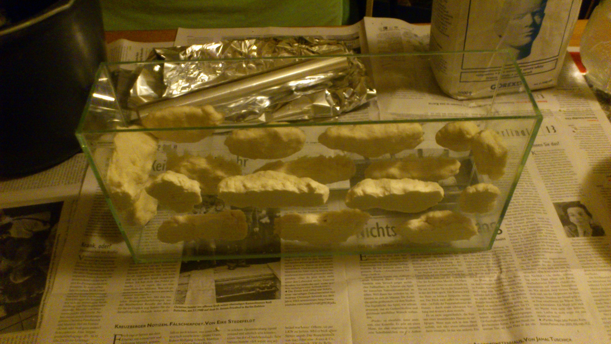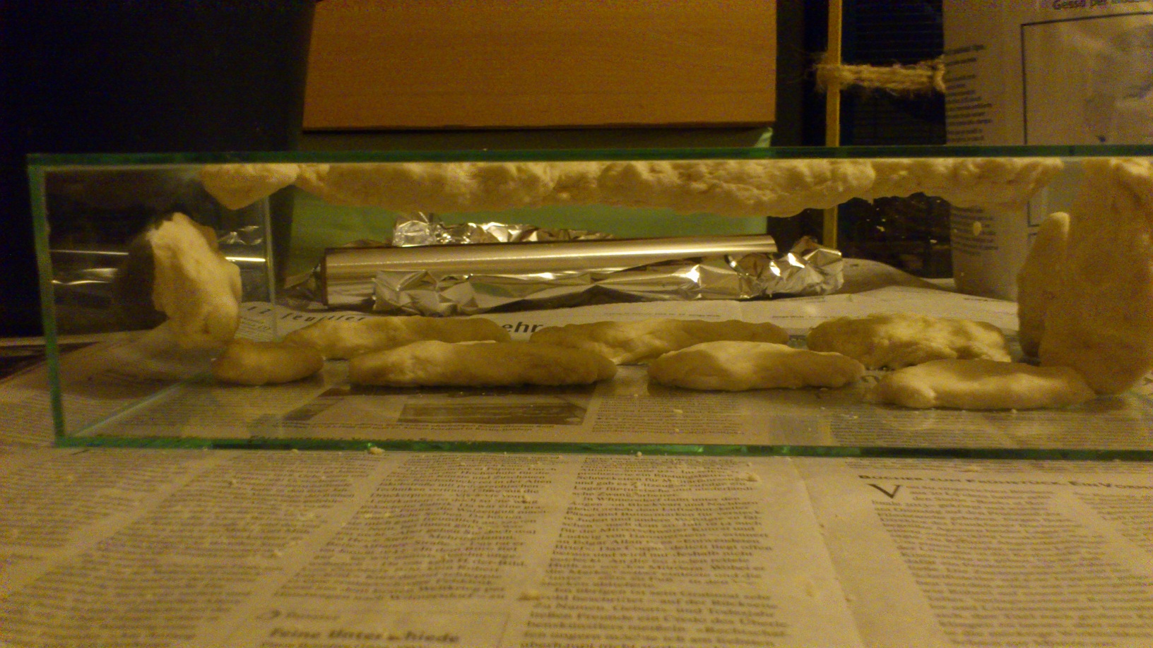 Nachdem nun alle Negativabbilder der Kammern fertig waren, habe ich den Modelliergips angemischt. Auf der Packung stand 1,4kg Gips sollen mit 1L Wasser aufgefĂŒllt werden. Ich habe mich vorsichtshalber genau an die Anleitung gehalten und der Gips wurde leicht dickflĂŒssig. Dann habe ich den Gips in das Glasbecken gegossen und aufgepasst, dass ich nicht auf die Kammern gieĂe, sondern langsam von der Mitte her aufgefĂŒllt bis fast zum oberen Rand.