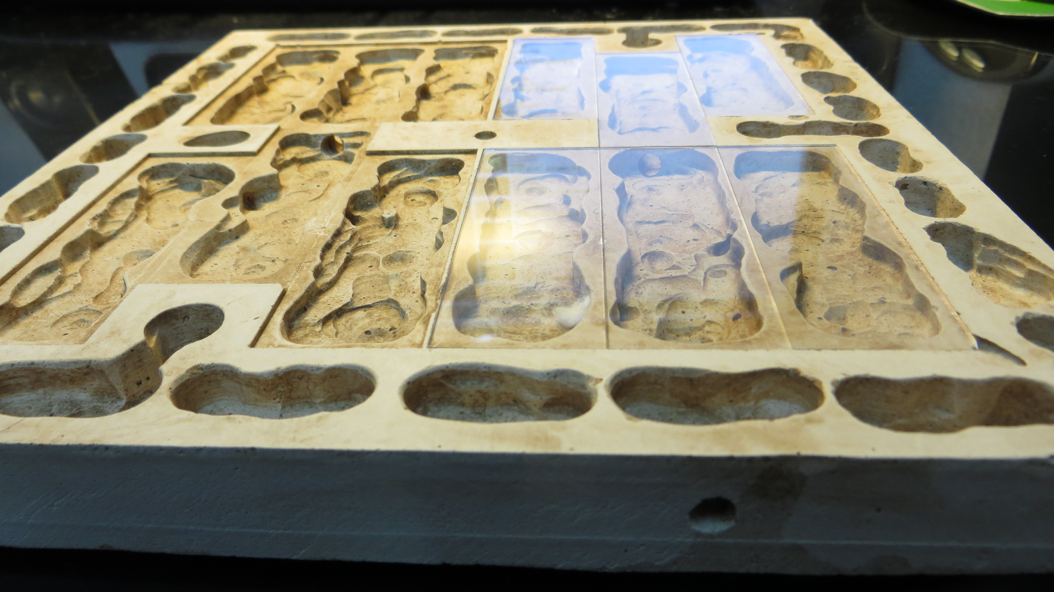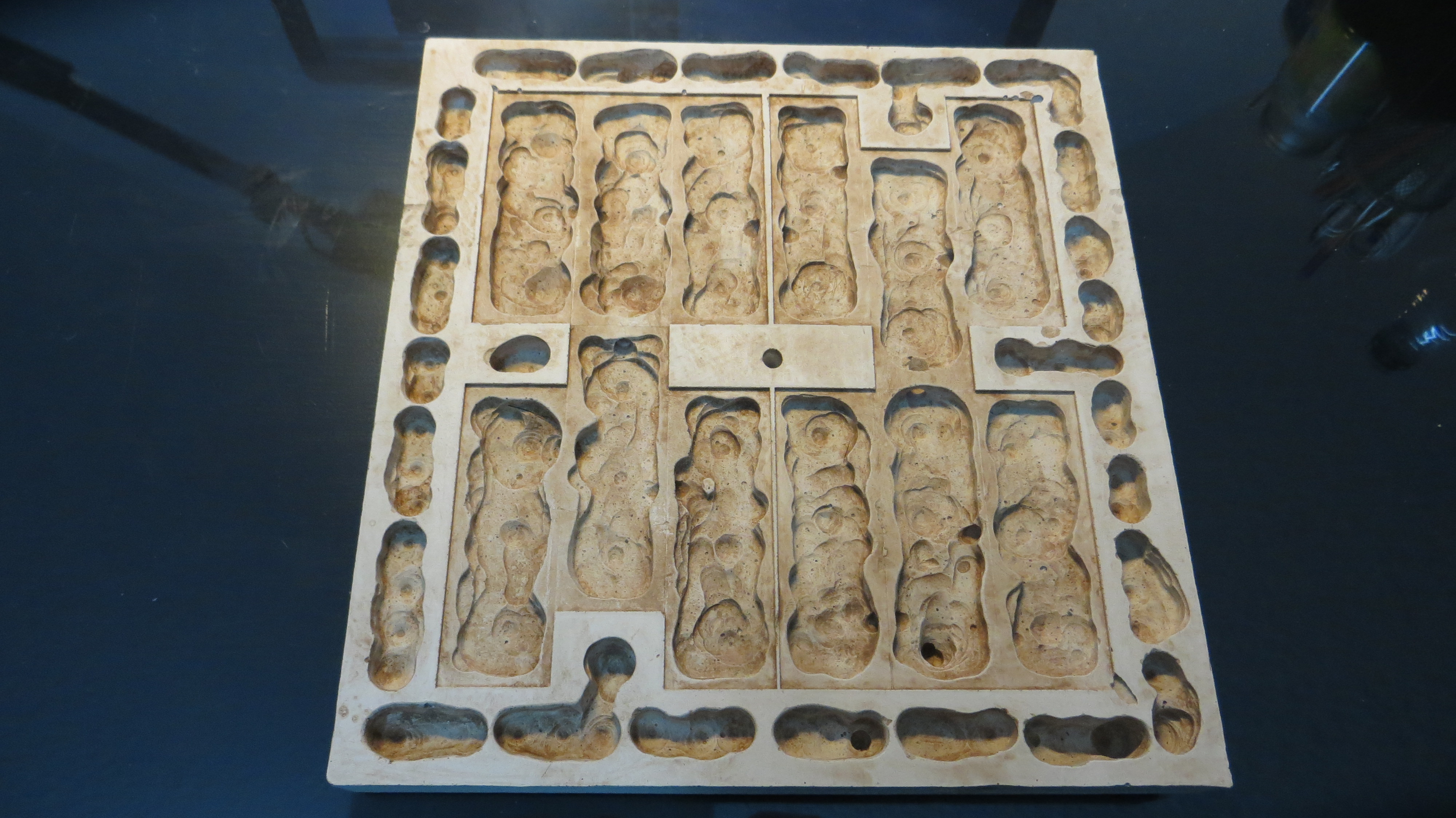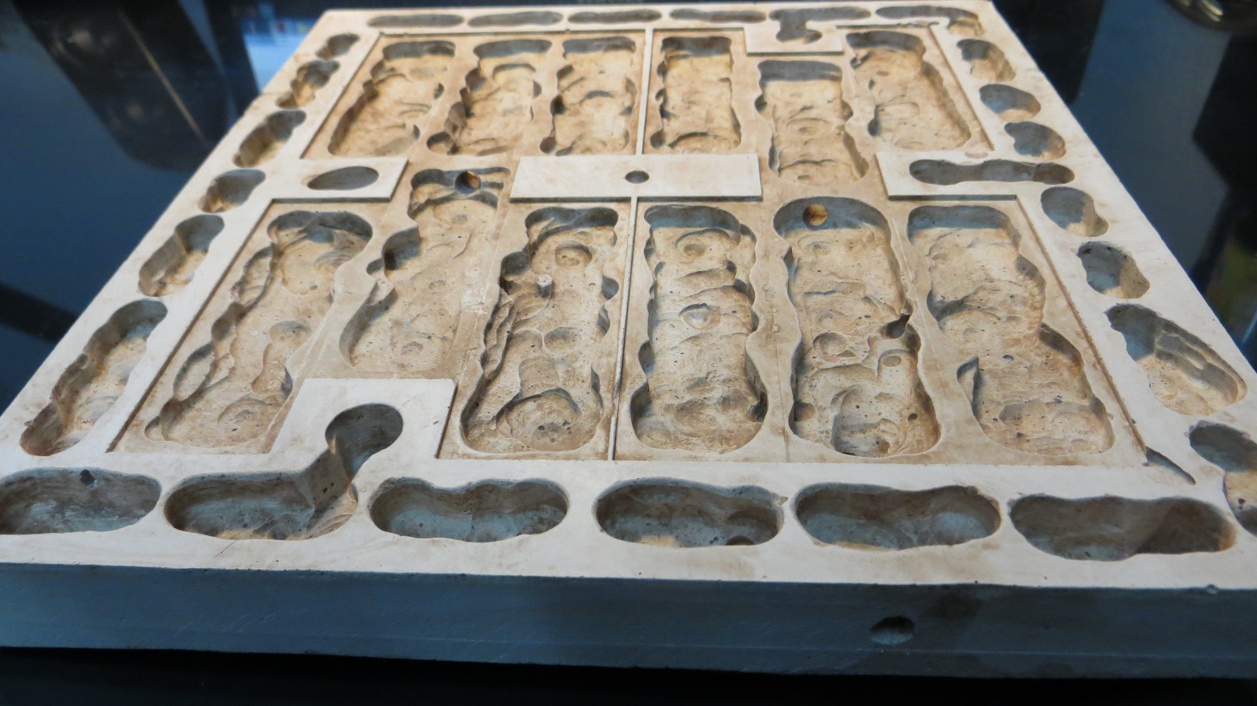 Mit Gips ausgießen, nach dem Erstarren wird die Gipsplatte herrausgelöst.(Bild1)