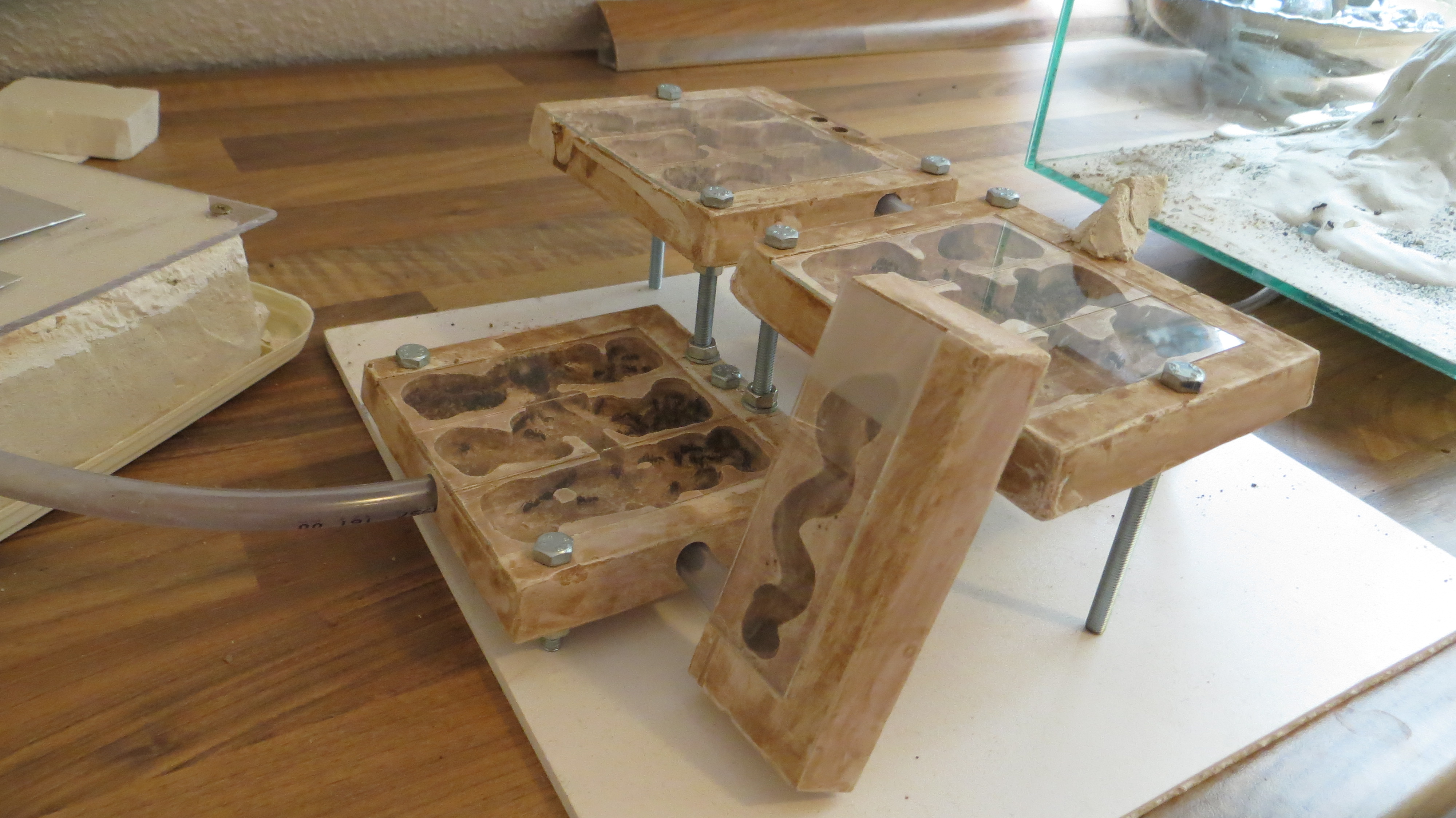 ich verwende diese Nestform (mit je 3 Objektträgern pro Platte) schon länger und bin damit immer gut gefahren. werden kleinere Platten gegossen und verbunden kann zum reinigen einfach die verschmutzte herausgenommen werden und durch eine neue ersetzt werden. Die alte wird mitsamt der Ameisen in die Arena gelegt bis diese wieder ins Nest zurüchziehen.