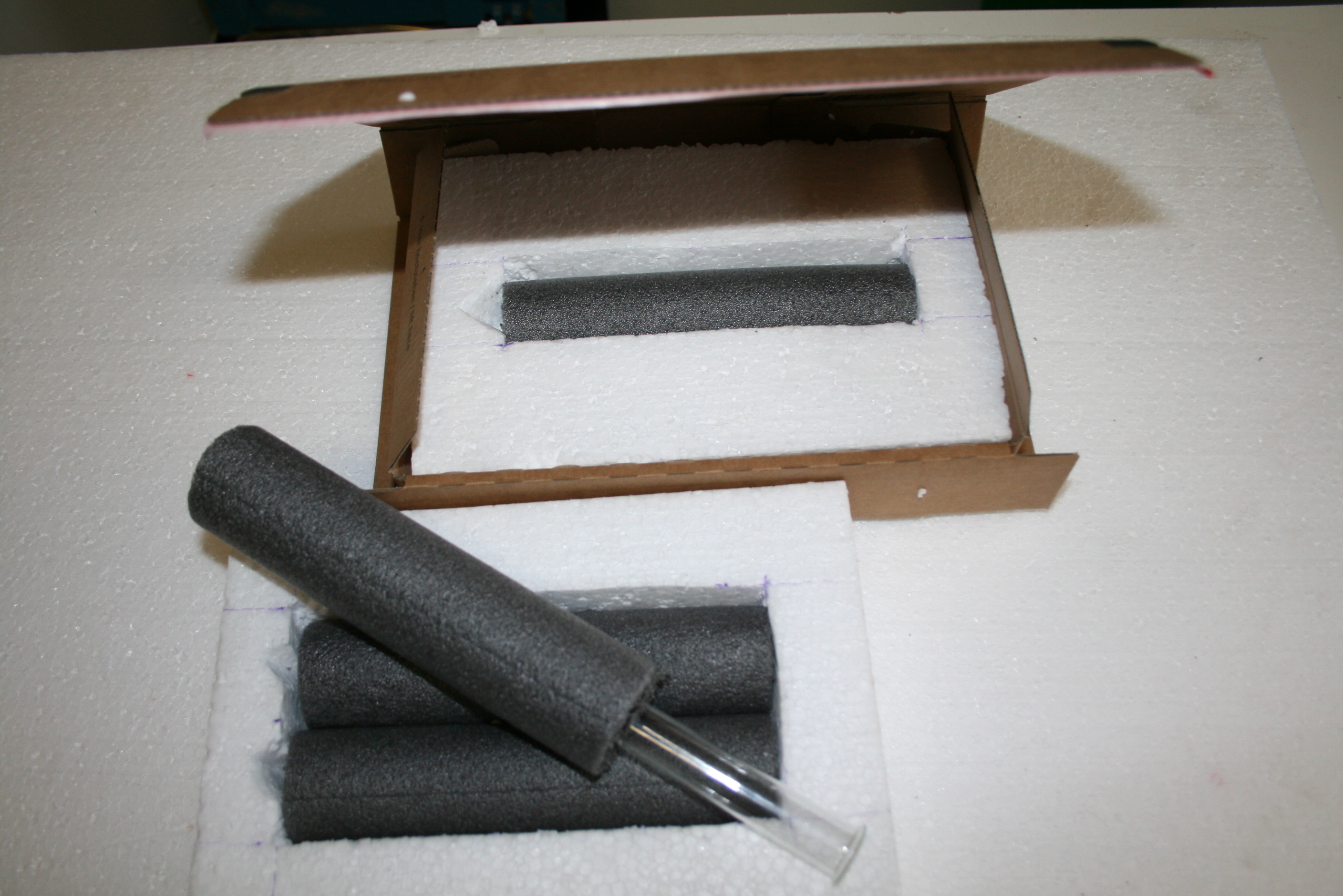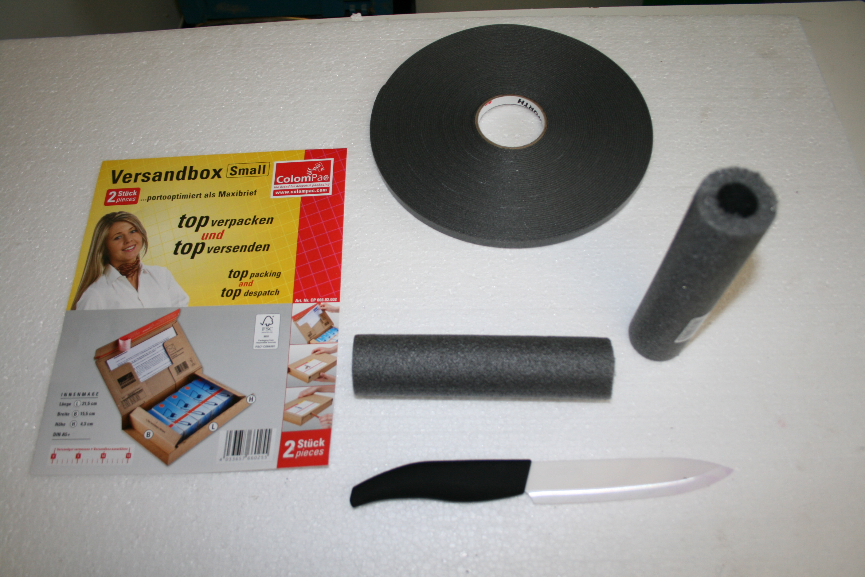 Man nehme dazu Versandkartons in der Größe Maxibrief, Styropor, Moosgummi, Rohrisolierung, und ein Messer sollte nicht fehlen.