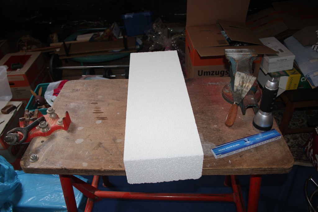 Zuerst sÀge ich mit der HandsÀge (Bild 1) den Ytong auf 50cm, damit er ins Terrarium passt. Die 50cm habe ich mir mit der Ahle und dem Meterstab markiert (Bild 2).