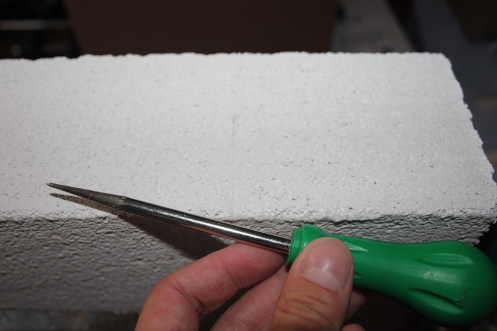 Die Maße des BewĂ€sserungsgraben habe ich mir ĂŒber die Bauanleitung ausgerechnet und ebenfalls mit Hilfe von Meterstab und Ahle angekratzt. Danach habe ich den Spachtel immer ein paar mm in die Linien reingeklopft (mit einem der Schraubendreher als sanfteren Hammerersatz) und dann einen kleinen Schlitzschraubendreher immer leicht hineingeklopft und kleine StĂŒckchen herausgebrochen. Nach 3 DurchgĂ€ngen hatte ich somit die gewĂŒnschte Tiefe Erreicht (Bild 8).