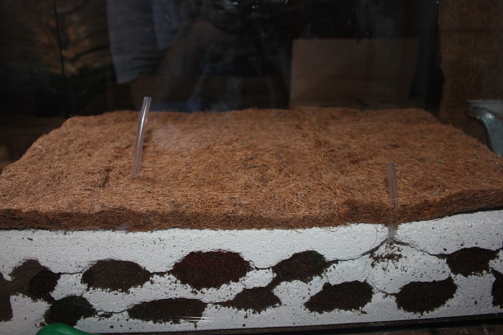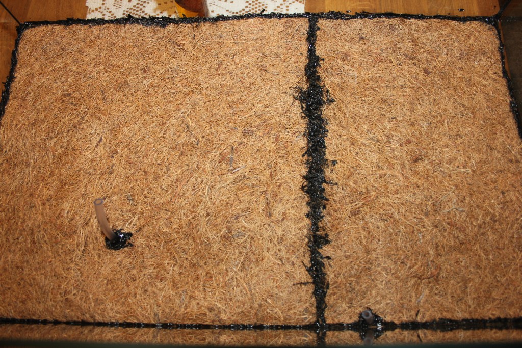 Damit keine Ritzen offenbleiben, in denen Ameisen oder deren Unrat landen könnten, wollte ich das ganze abdichten und damit das Ganze noch etwas Atmen kann hatte ich beschlossen Kokosmatten statt Plexiglas zu benutzen. Ich habe also erstmal die Kokosmatten auf Maß (mit dem Teppichmesser) zurechtgeschnitten, hineingelegt und Löcher mit Ahle und Kreuzschlitzschraubendreher hineingemacht fĂŒr die BewĂ€sserung und den Eingang. In beide Löcher habe ich SchlauchstĂŒcke gesteckt (Bild 1).