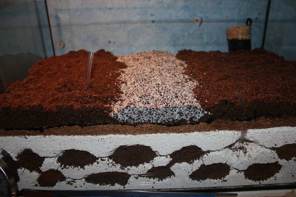 Zuerst habe ich die Arena mit der Terrarienerde und dem Aquarienkies befĂŒllt (Bild 1)