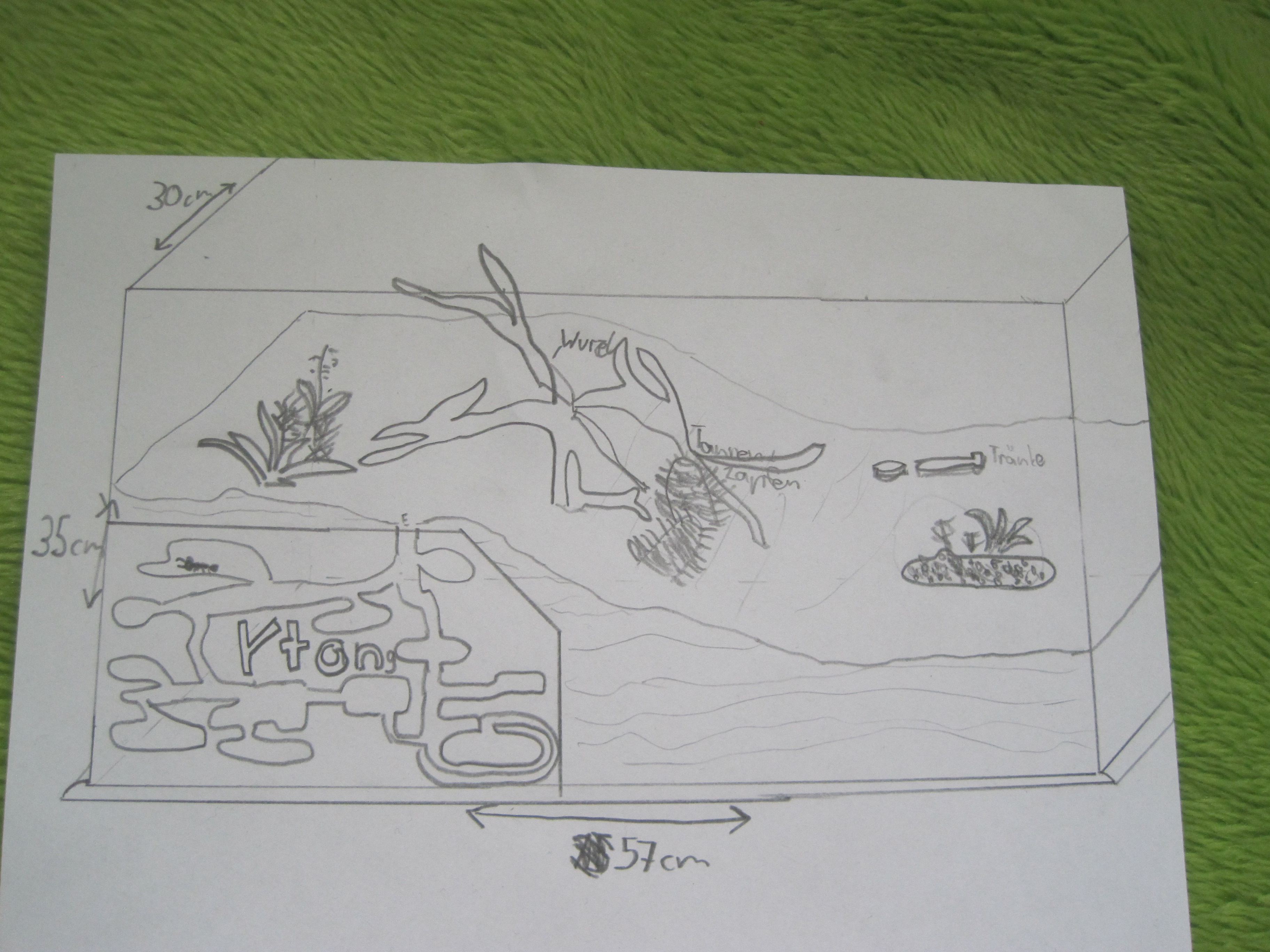Von der Einrichtung her soll es wie in einem Fichtenwald aussehen. Ich möchte eine größere Wurzel oder etwas Ähnliches mittig platzieren, auch Nadeln und Tannenzapfen sollen nicht fehlen. Ich werde Plastikpflanzen, sowie auch echte Pflanzen verwenden. Unter dem einen Gitter im Deckel wollte ich einen "See" in einer Schüssel machen, indem ich die Schüssel mit Wasser fülle und dort bis zur Oberfläche groben Kies hineinwerfe, damit die Ameisen nicht ertrinken.