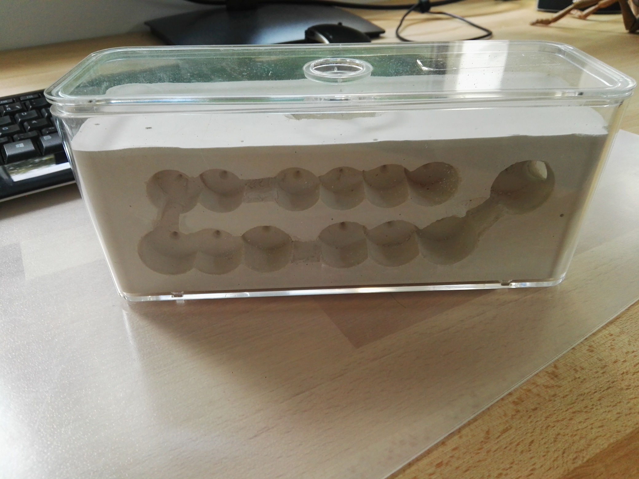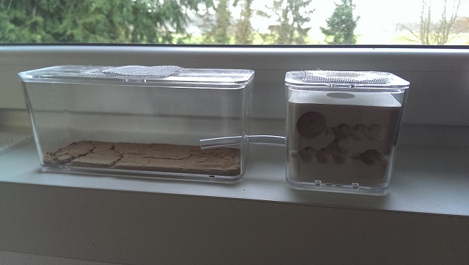 Da ich allerdings von meiner Anfangszeit noch wenig begeistert bin von Gips da er staubt und es berichtet wurde das der Gipsstaub daran Schuld ist das die Kolonien eingehen (Staubpartikel in den Tracheen oder aggressives Verhalten durch Arbeiterinnen gegenĂŒber anderen die bei einer anderen Nestart niemals auftraten).