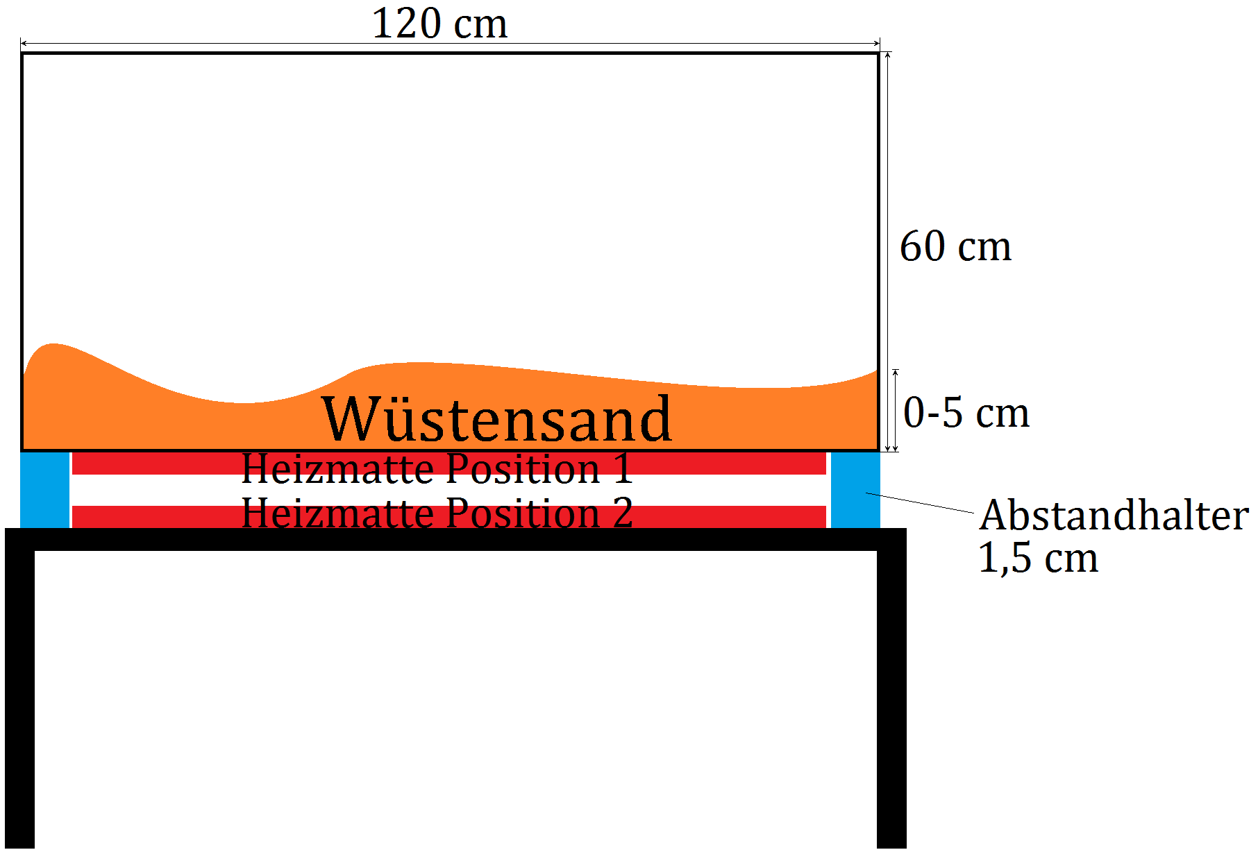 Bei den Cataglyphis will ich die Heizmatten jedoch zeitnah einsetzen. Das liegt insbesondere daran, dass man dann die schnellen SandlÀufer viel schöner beobachten kann, wenn der Sand richtig schön warm wird. Dazu zunÀchst meine Modellvorstellung vom Aufbau: