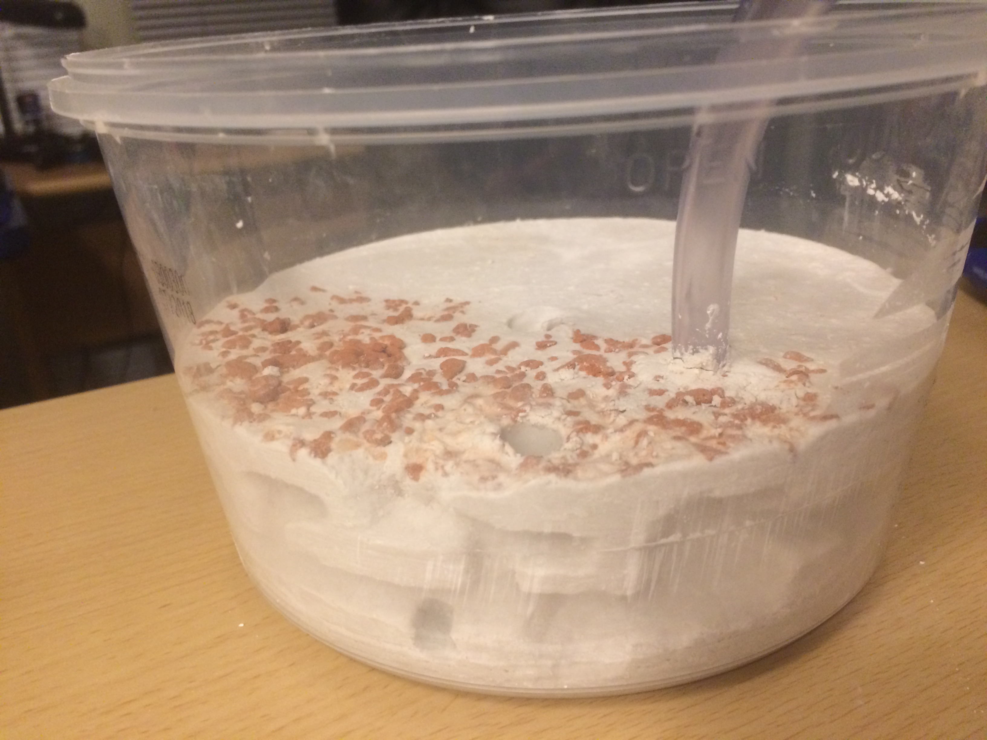 Habe zuerst mit GLOREX Alabit, Modelliermasse, WeiĂ (Gips bei Amazon) die Haribo Dose ein bisschen gefĂŒllt damit genug Platz fĂŒr ein Nest ist und oben noch genug Platz fĂŒr Arena und Ausbruchschutz.