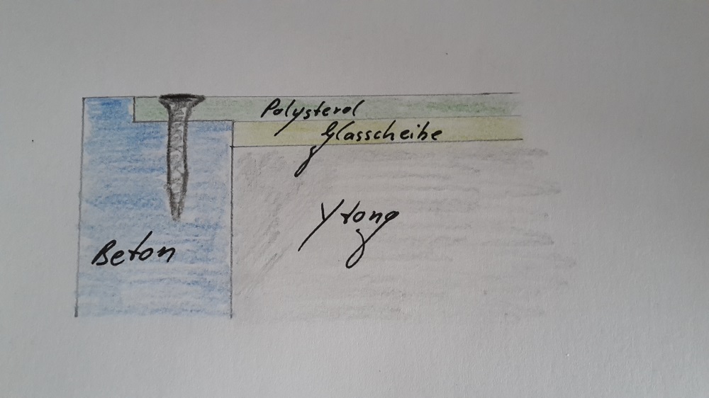 - Geplant war das Ganze mit einer Plexiglasscheibe abzudecken. Die ersten Rückmeldungen dich ich damals bekommen habe waren, dass Plexiglas sich bei Feuchtigkeit verzieht und die Ameisen das verkratzen, das Ganze also eher ungeeignet ist. Ich habe nun eine Scheibe aus Hobbyglas (Polysterol) gefunden, welche auch in Feuchträumen eingesetzt werden kann. Diese Scheibe hat die Maße 50x25 cm, steht also auf allen Seiten 2 cm über den Ytong hinaus. Befestigt werden soll die Scheibe über Dübel, die in dein Betonmantel eingegossen werden. Deshalb auch die Breite des Betonmantels von 3 cm. 2 cm für die Scheibe und 1 cm Rand