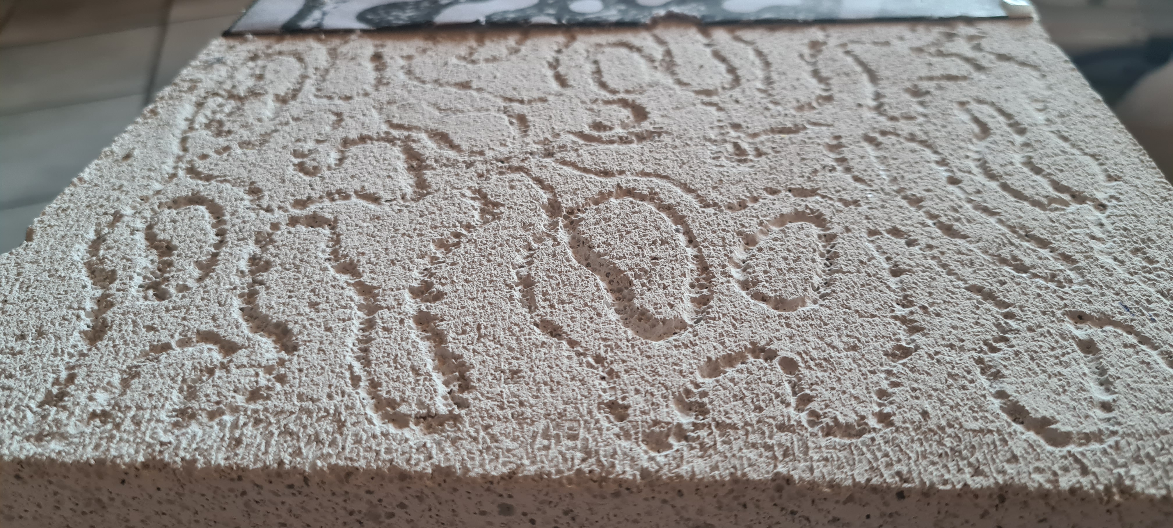 Als nächster Schritt wird nun mit einem spitzen Gegenstand oder einem Dremel der dunkle Teil am Rand nachgezogen und später die Vertiefungen ausgearbeitet.